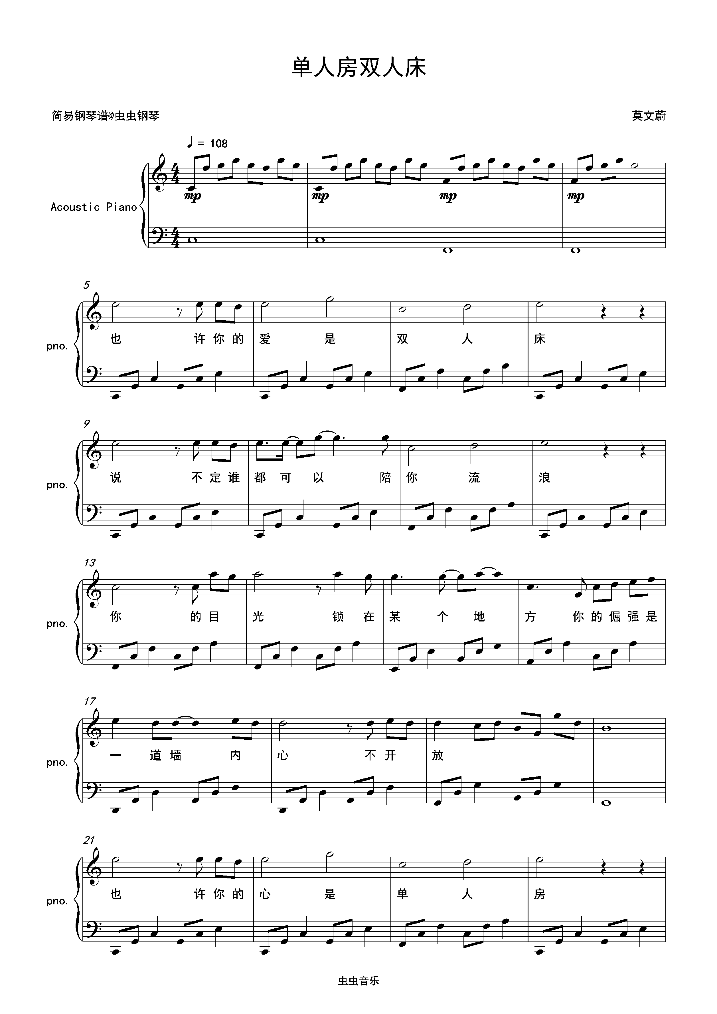钢琴谱:单人房双人床-莫文蔚 C调独奏