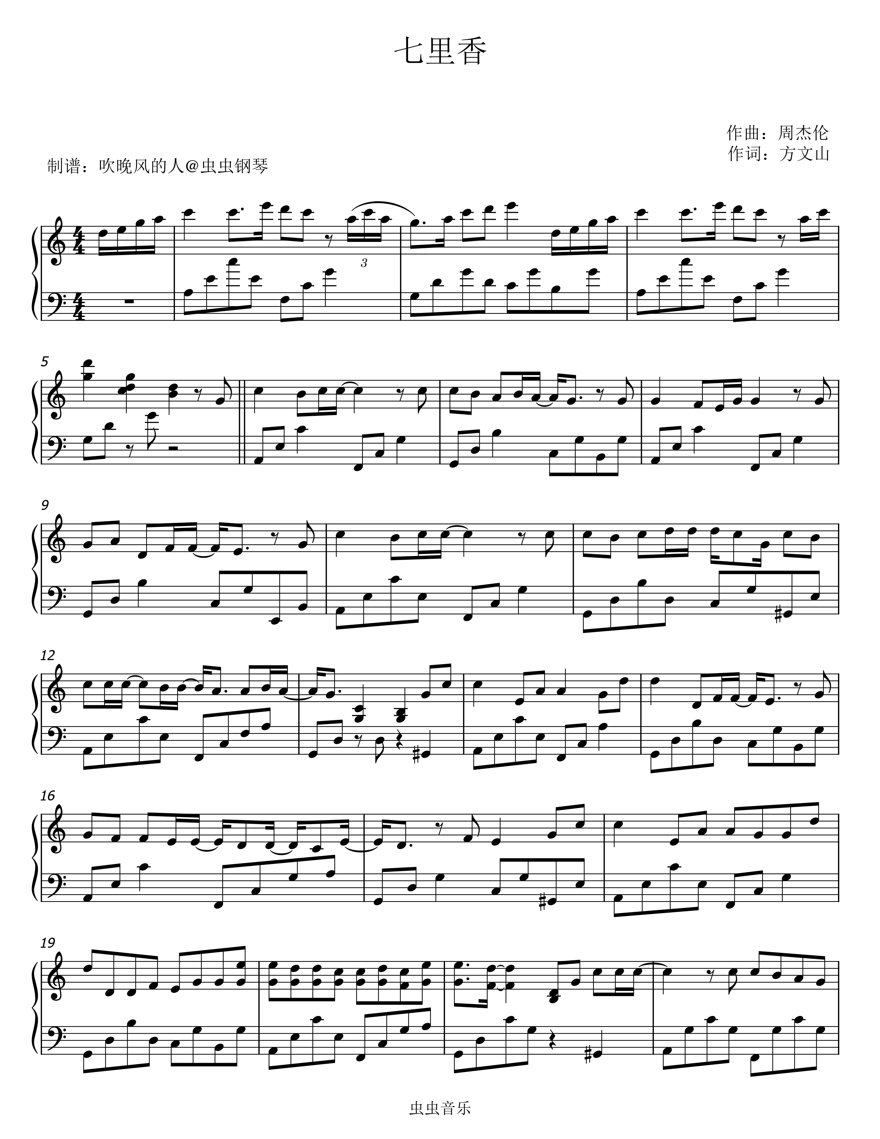 • 七里香钢琴简谱 C调 数字双手 方文山