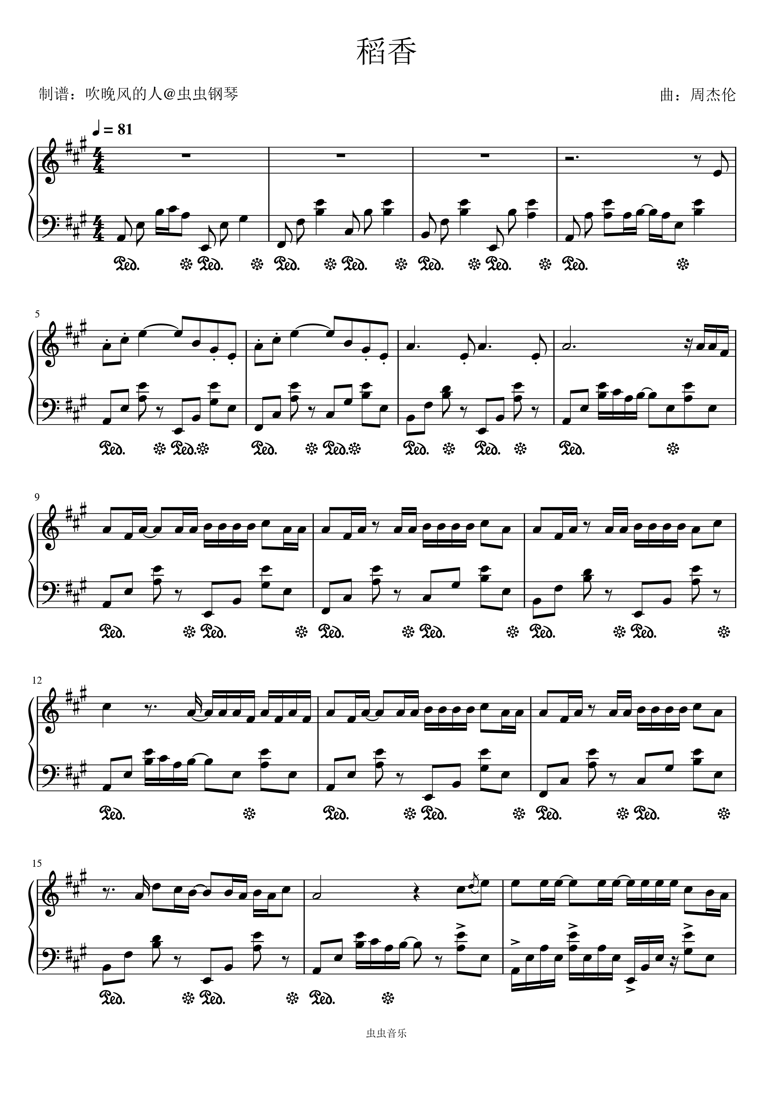 钢琴谱:周杰伦《稻香》A大调快乐独奏版