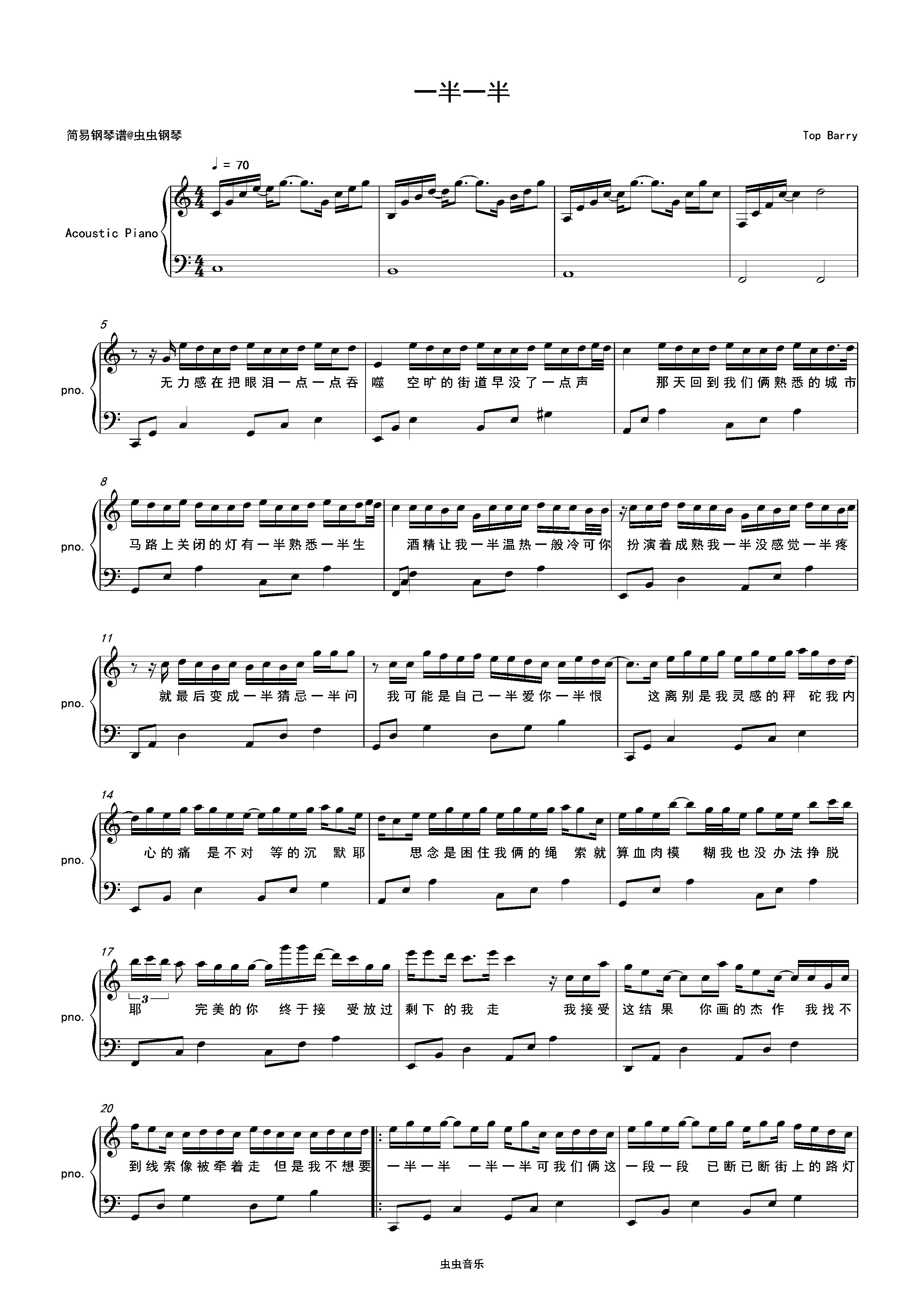 钢琴谱:一半一半-Top Barry C调独奏