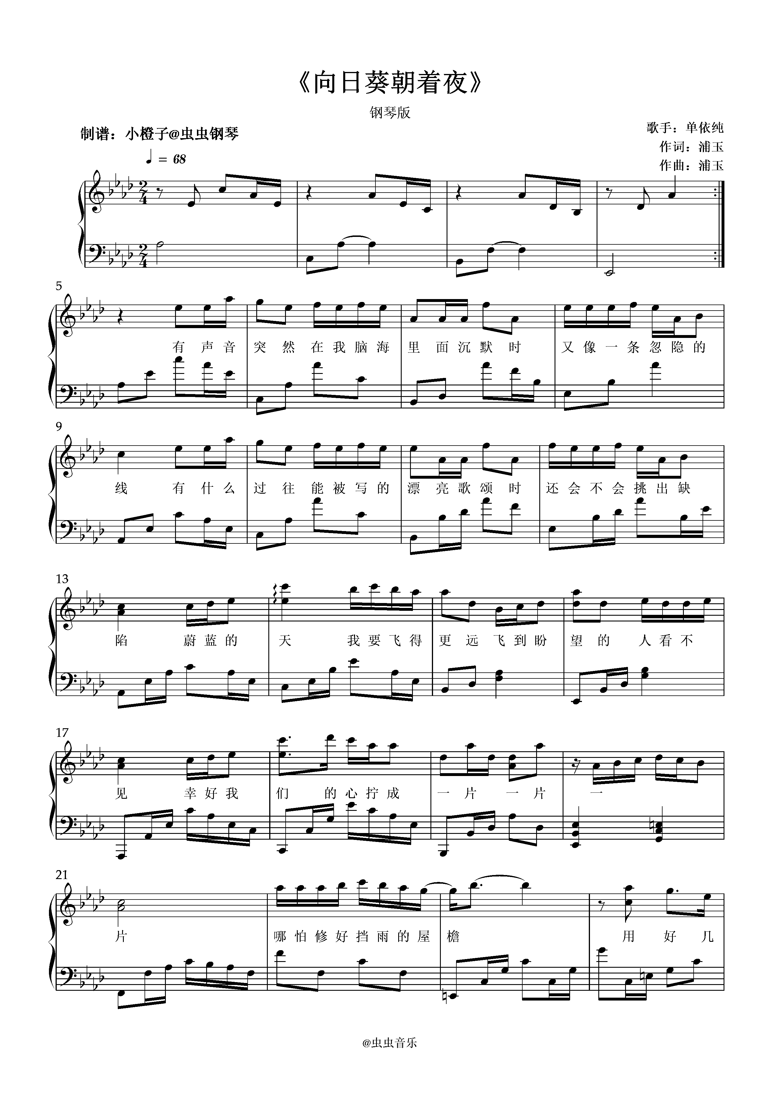 钢琴谱:向日葵朝着夜-单依纯//附歌词+钢琴版