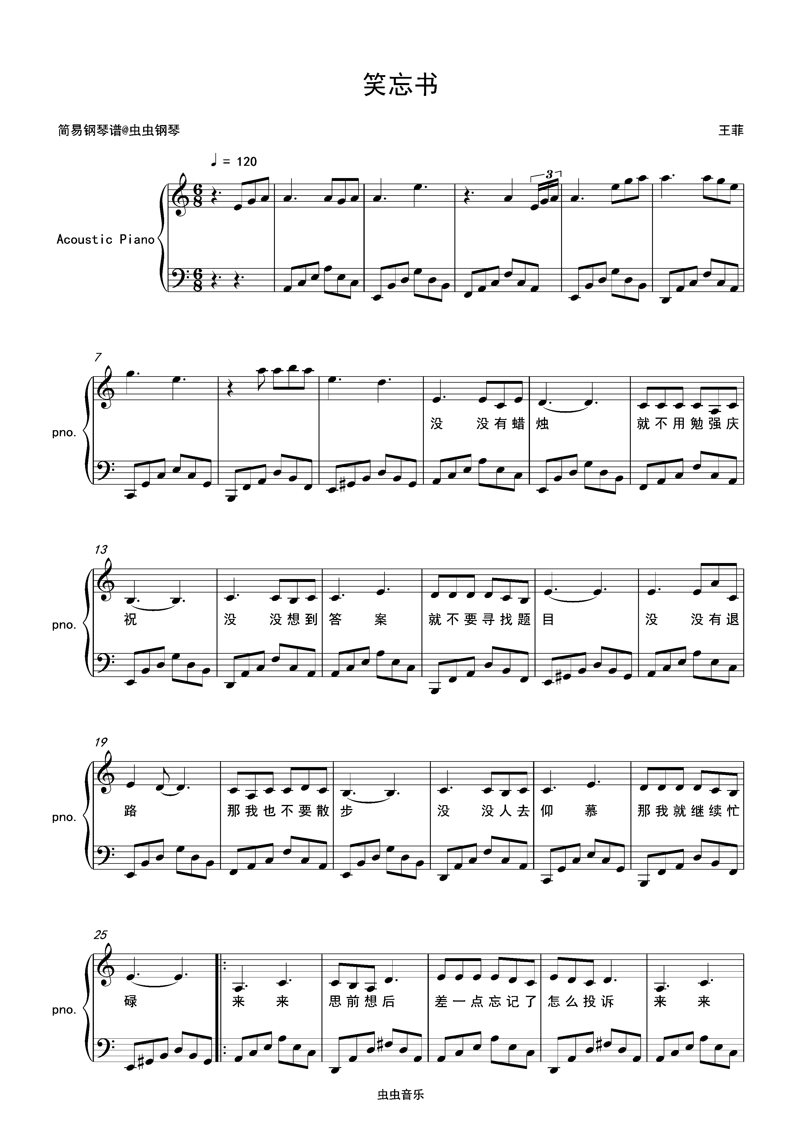 钢琴谱:笑忘书-王菲 C调独奏