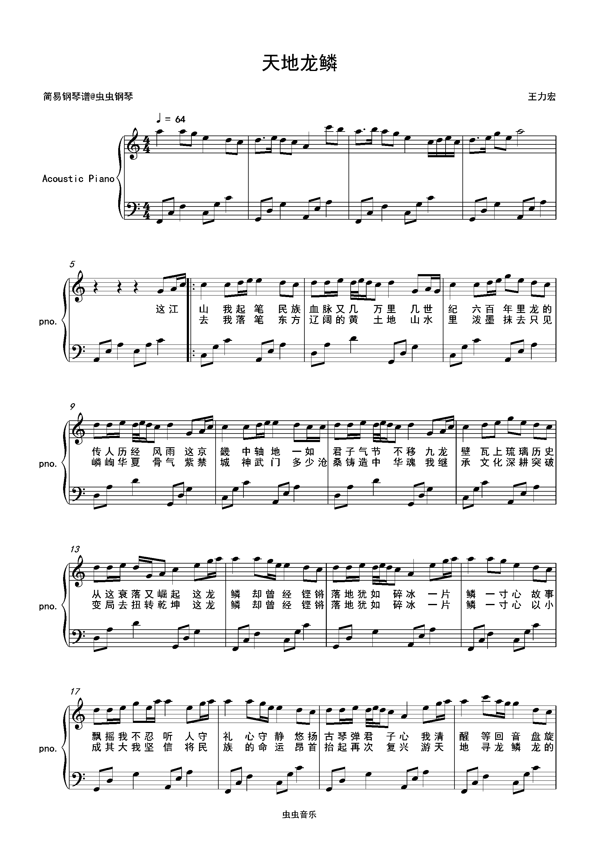 钢琴谱:天地龙鳞-王力宏 C调独奏