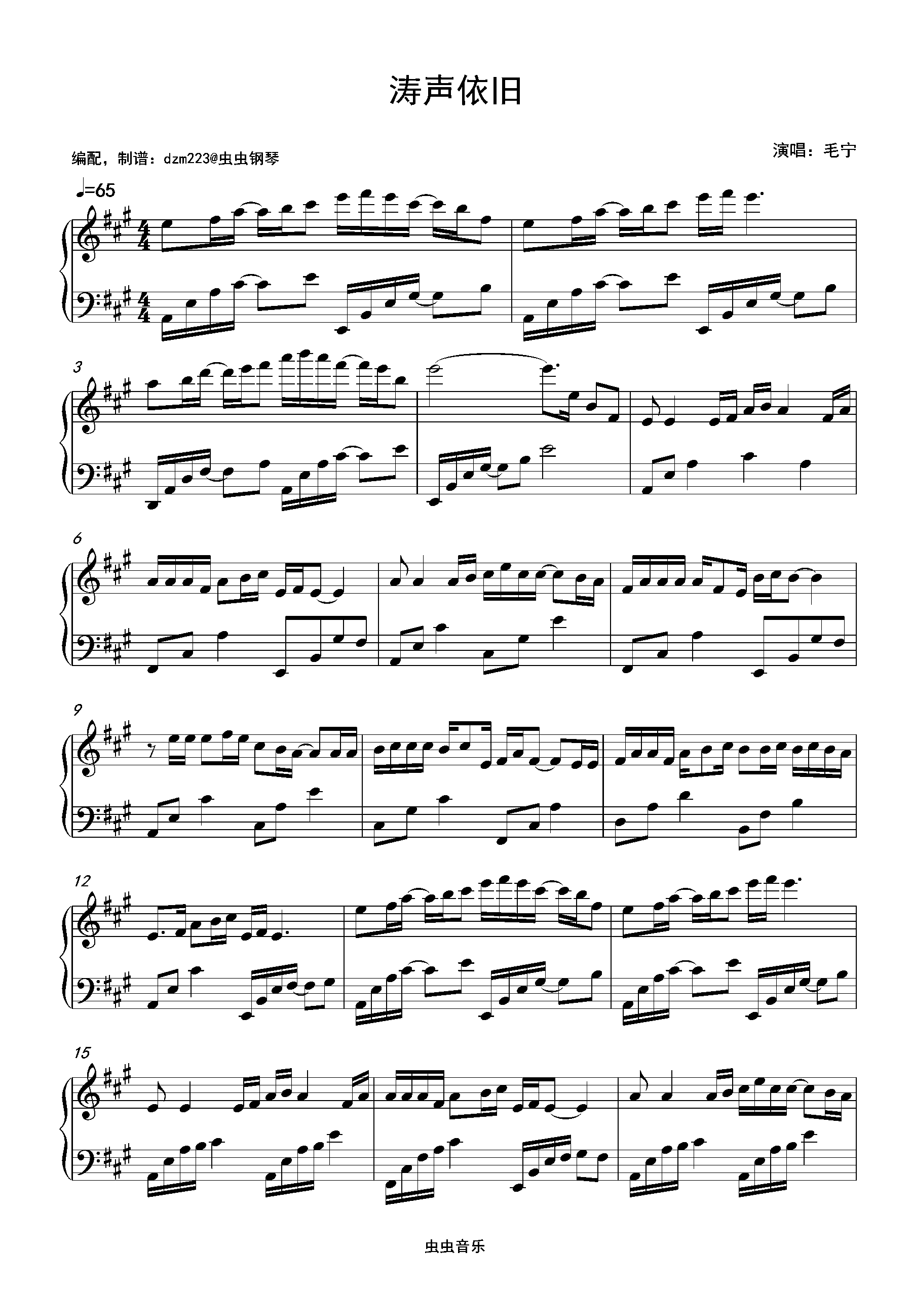 • 涛声依旧钢琴简谱 A调 数字双手 陈小奇
