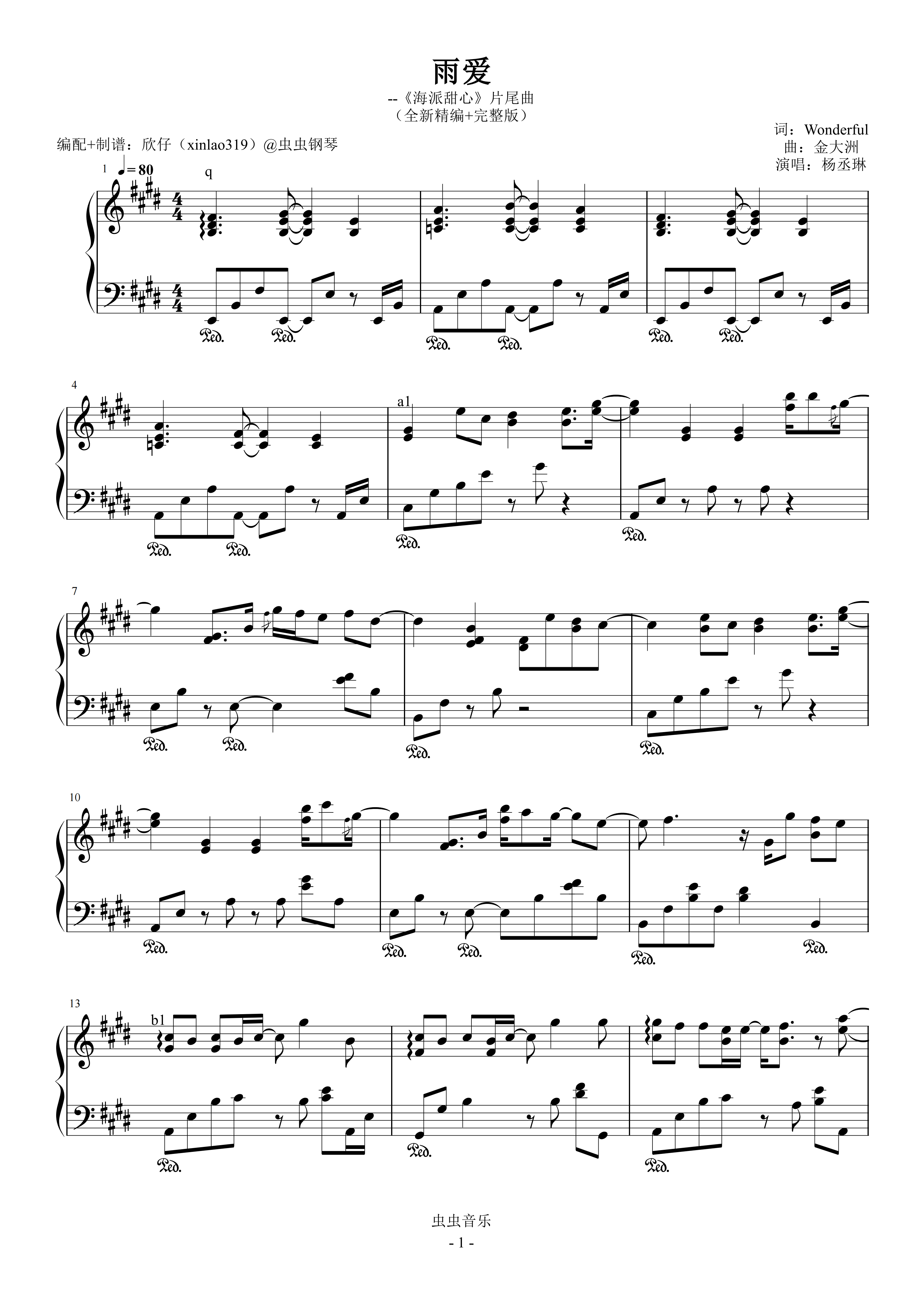 钢琴谱:雨爱(原调E、杨丞琳《海派甜心》片尾曲、全新精编+完整版)