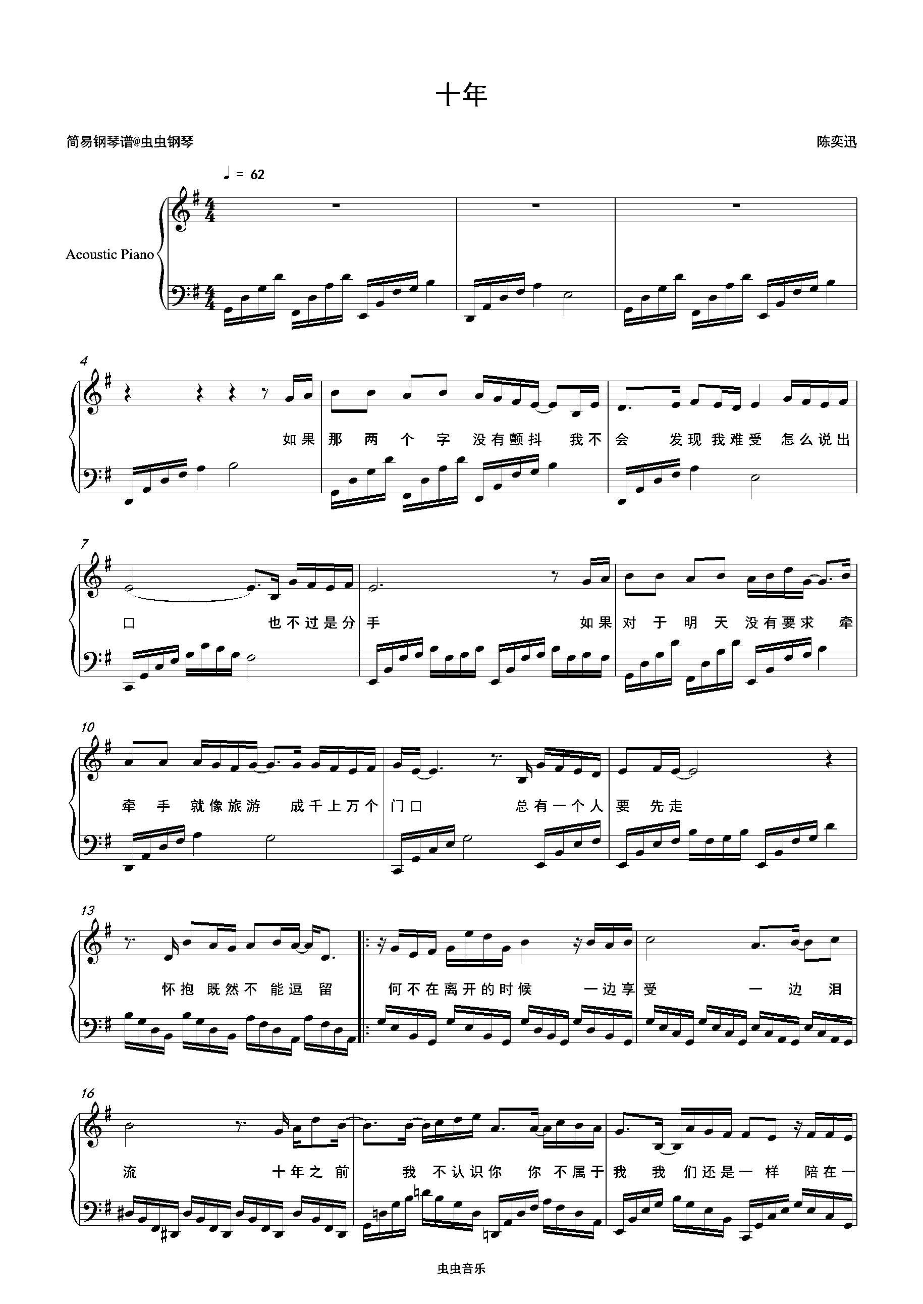 钢琴谱:十年-陈奕迅 G调独奏