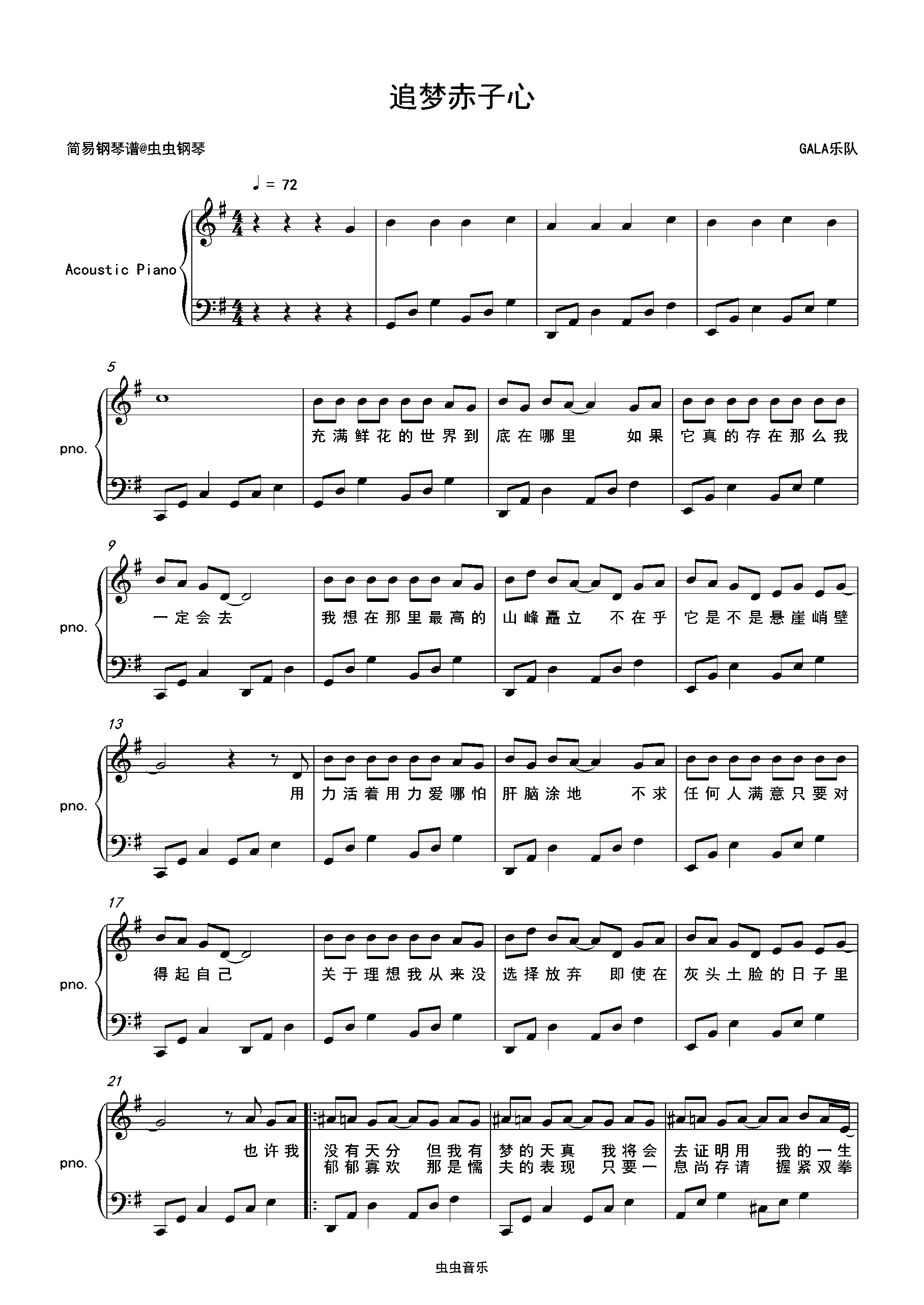 钢琴谱:追梦赤子心-GALA乐队 G调独奏