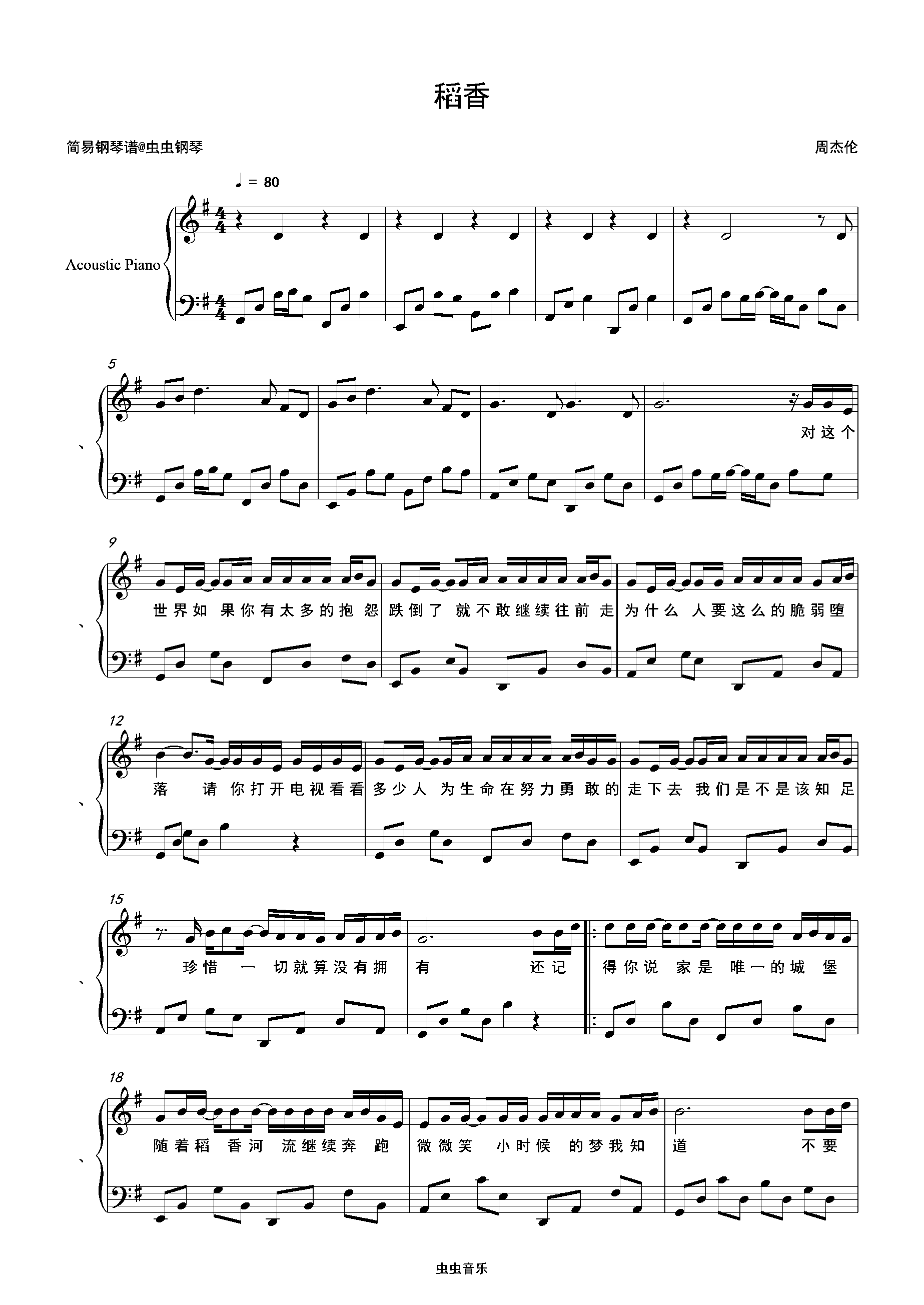 • 稻香钢琴简谱 A调 数字双手 周杰伦
