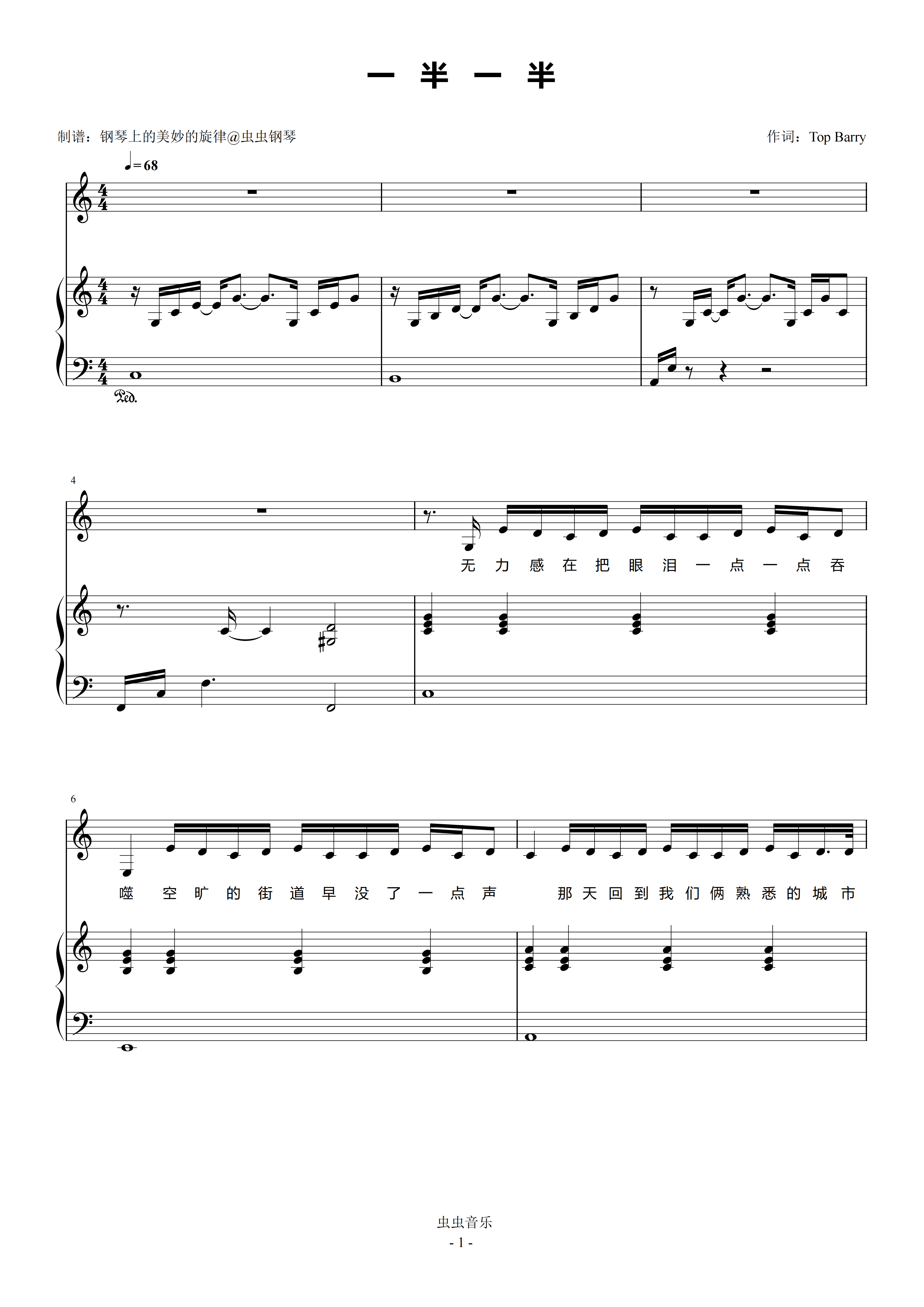 钢琴谱:一半一半 C调简易钢琴弹唱伴奏 带歌词 Top Barry