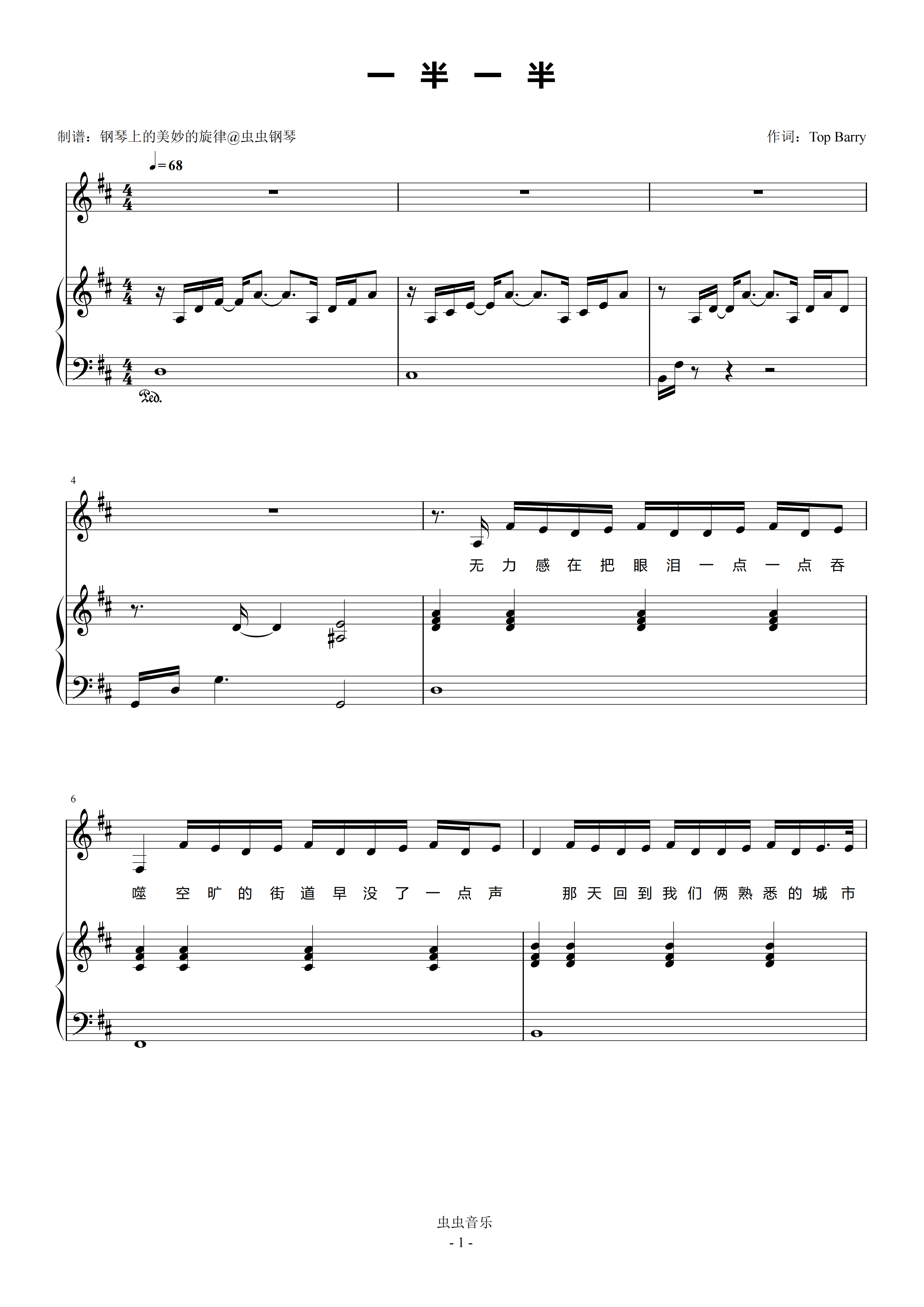 钢琴谱:一半一半 原调简易钢琴弹唱伴奏 带歌词 Top Barry