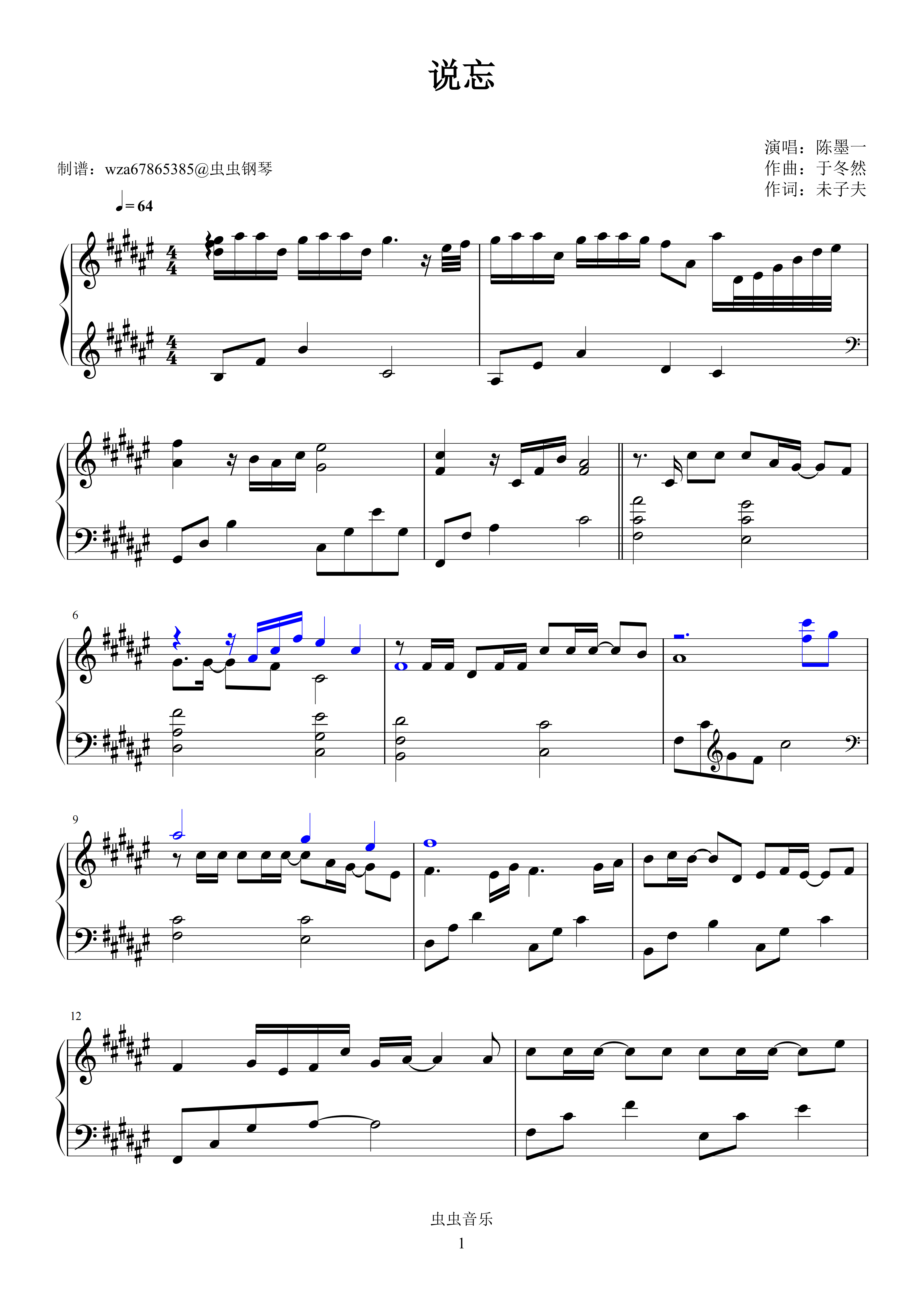 • 就忘了吧钢琴简谱 C调 数字双手 1K