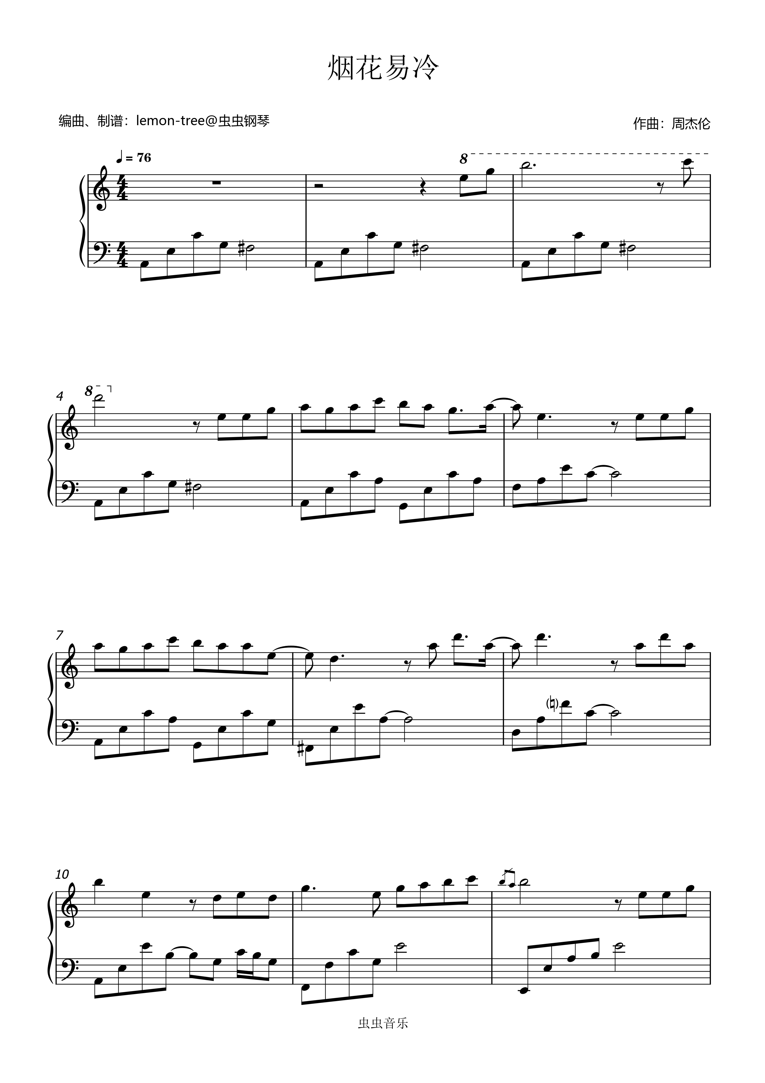 • 烟花易冷钢琴简谱 C调 数字双手 方文山