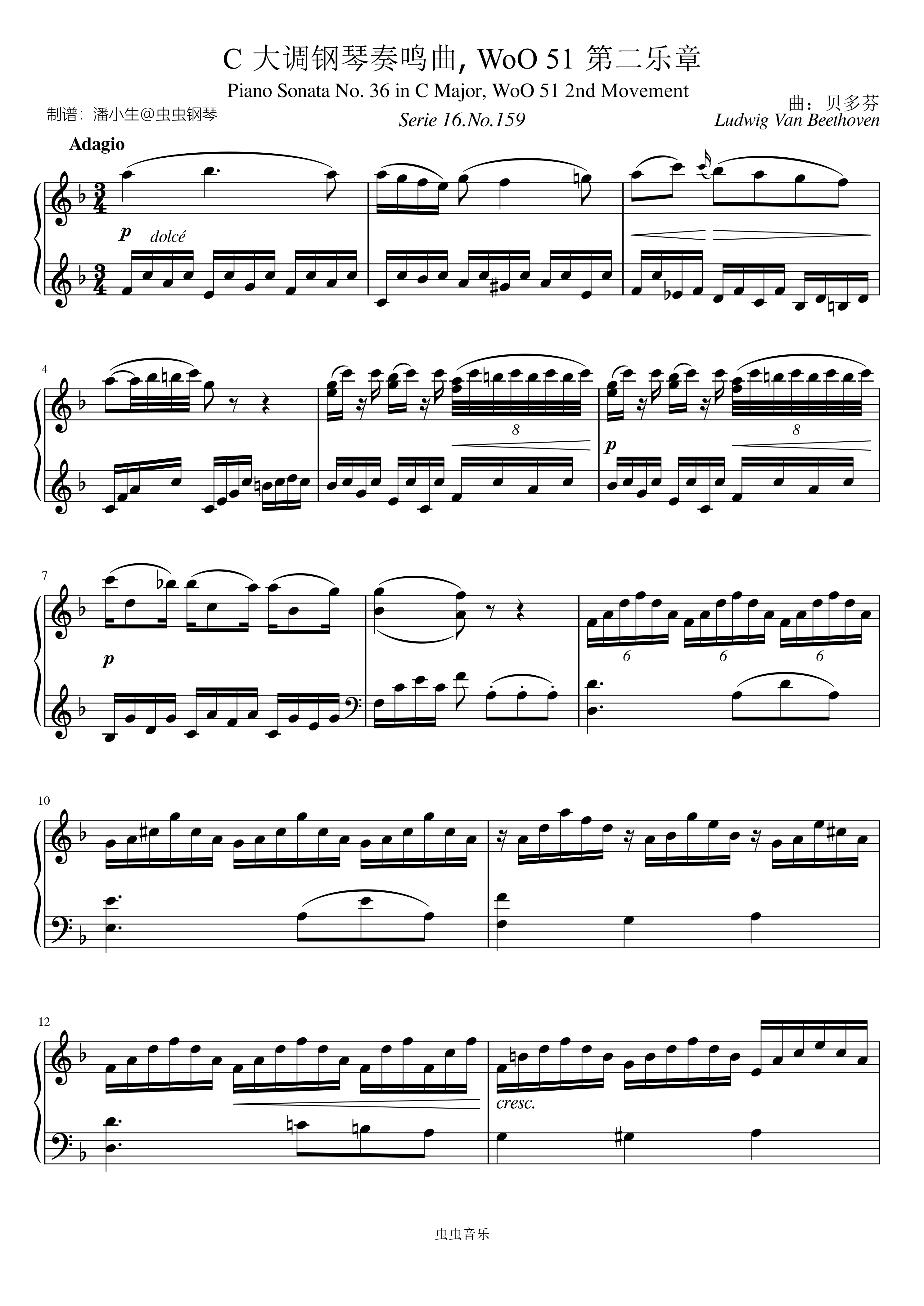 贝多芬 C大调钢琴奏鸣曲, WoO 51 第二乐章 原版 Beethoven Piano Sonata in C Major