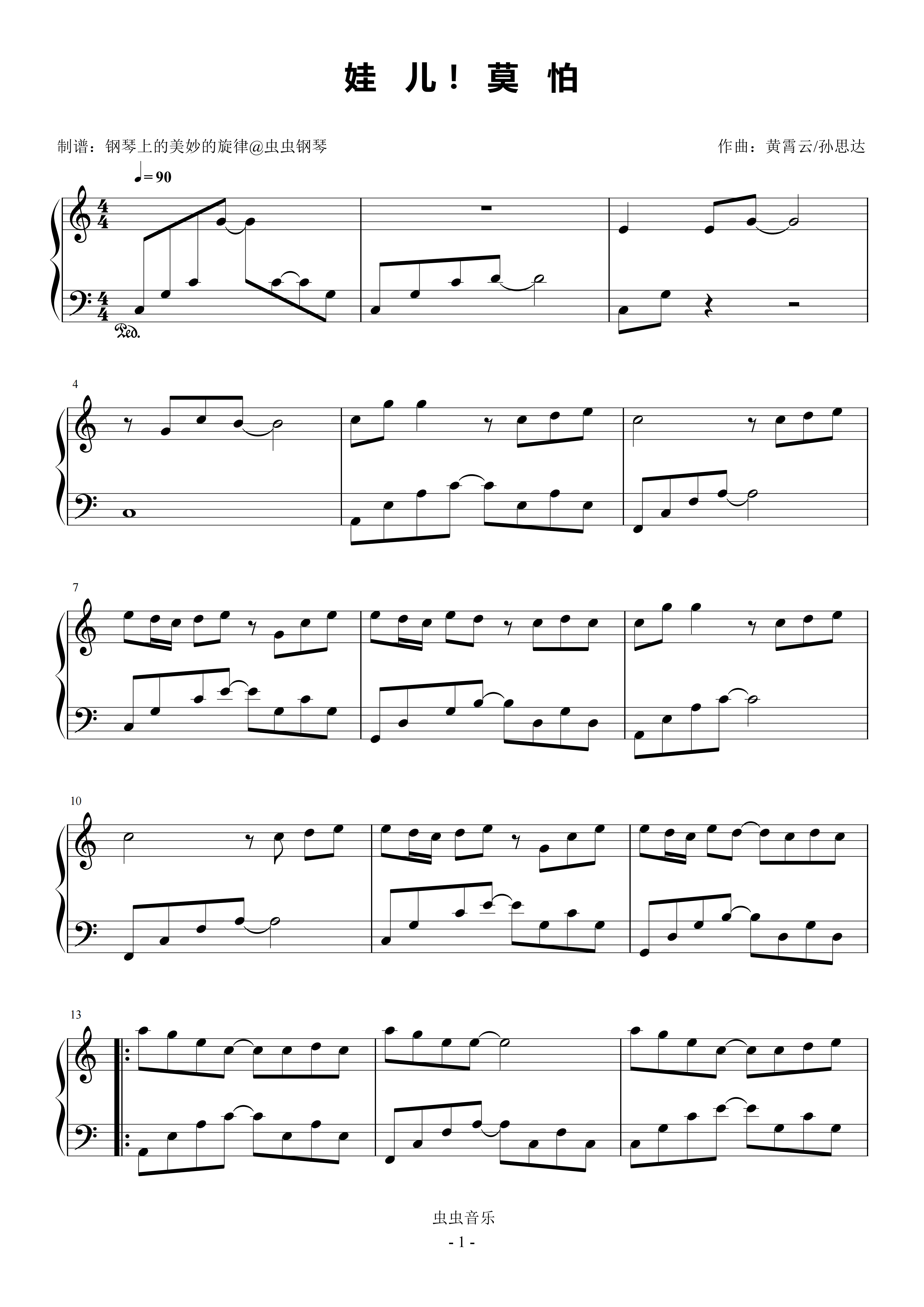 钢琴谱:娃儿!莫怕 C调简易版 黄霄雲