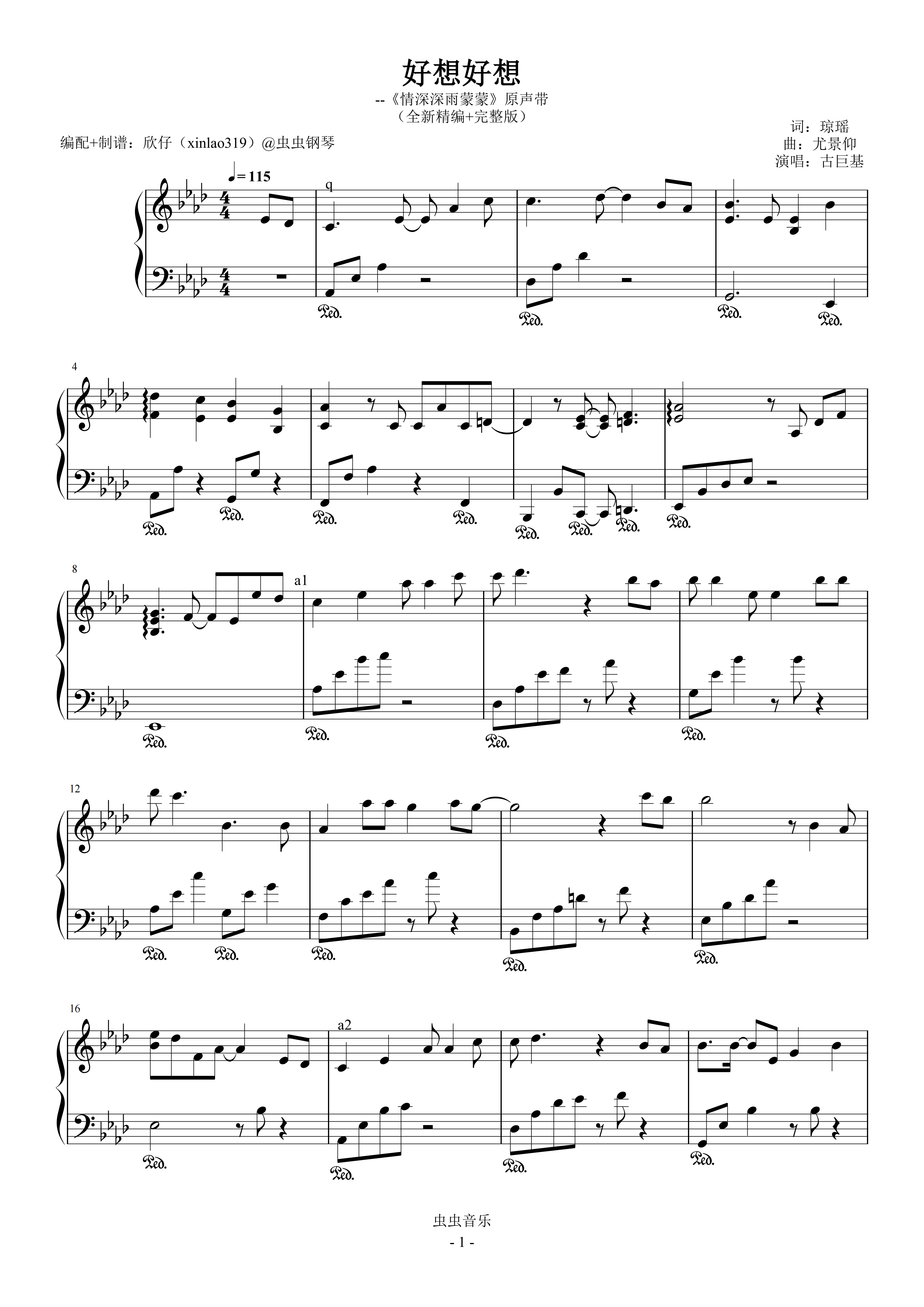 钢琴谱:好想好想(原调降A、古巨基《情深深雨蒙蒙》原声带、完整版)
