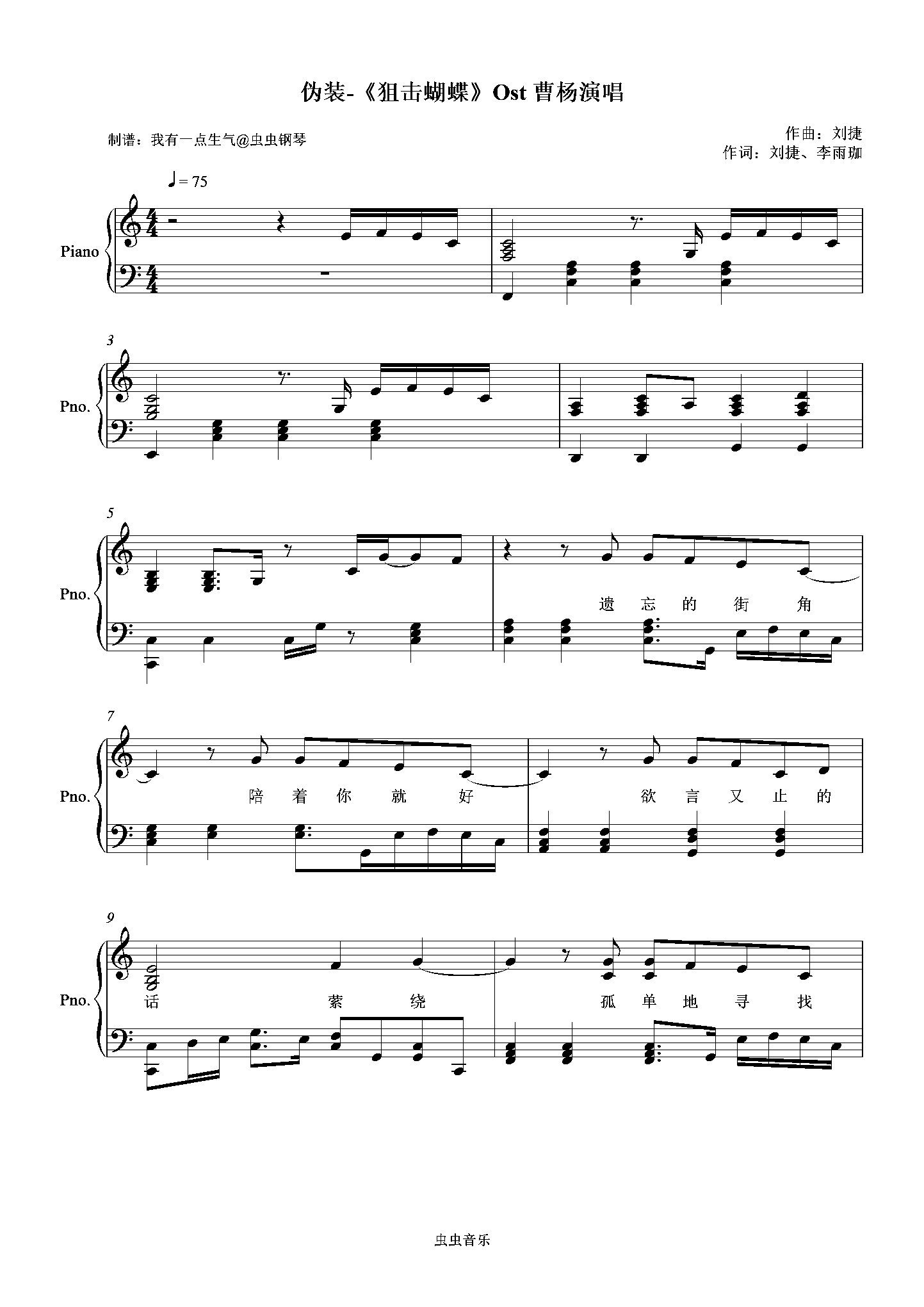 钢琴谱:伪装-曹杨 狙击蝴蝶电视剧插曲