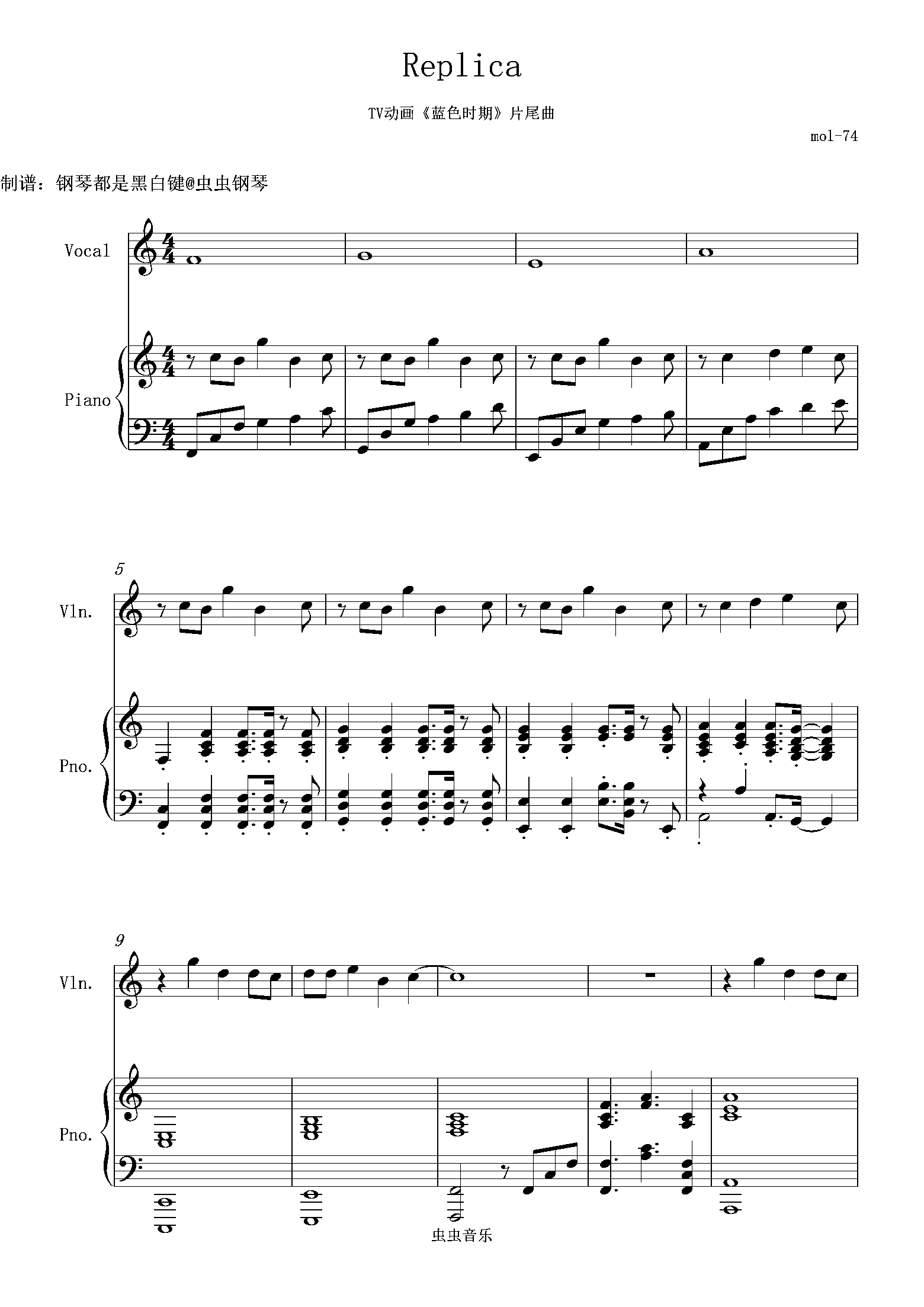 钢琴谱:(mol-74)《蓝色时期》片尾曲-Replica