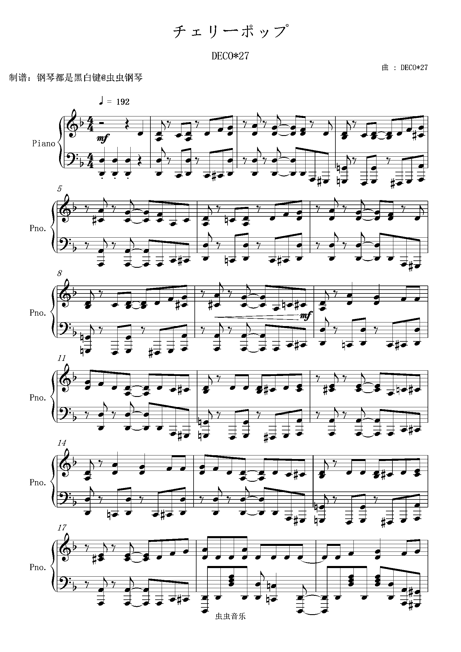 钢琴谱:【DECO*27 / 初音ミク】樱桃汽水/チェリーポップ