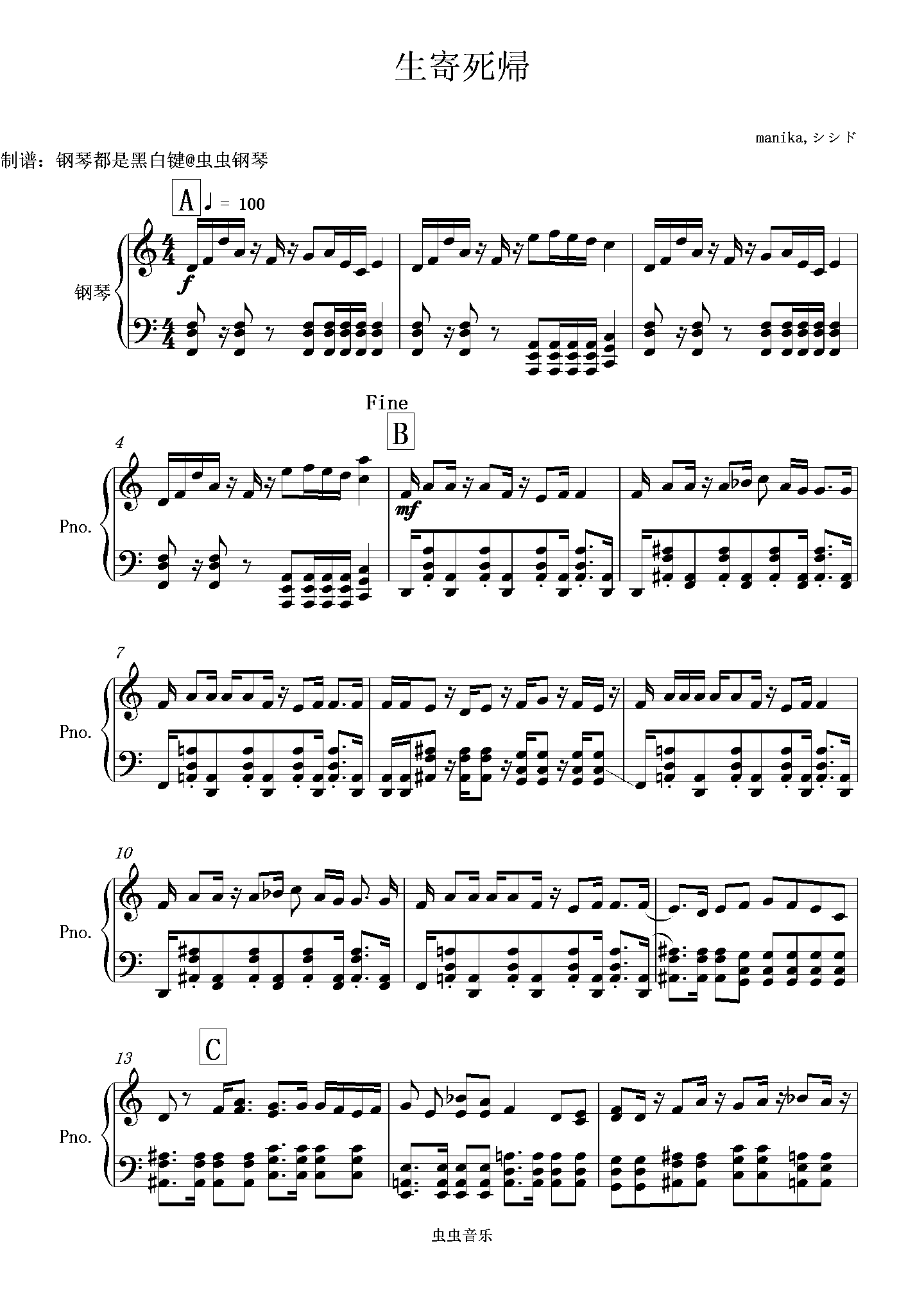 钢琴谱:【初音ミク&鏡音リン】生寄死帰