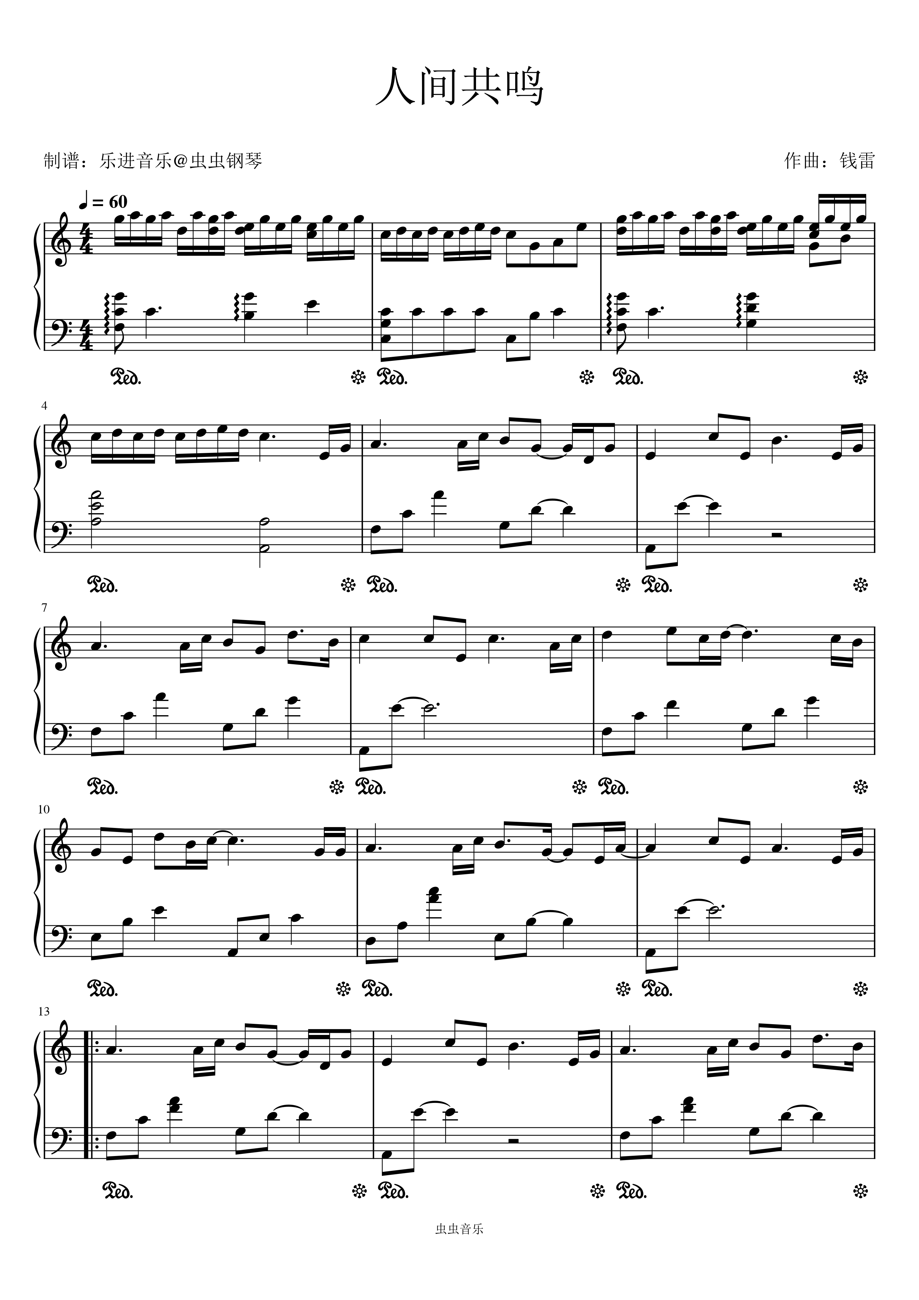 钢琴谱:《人间共鸣》C调简易版 无转调