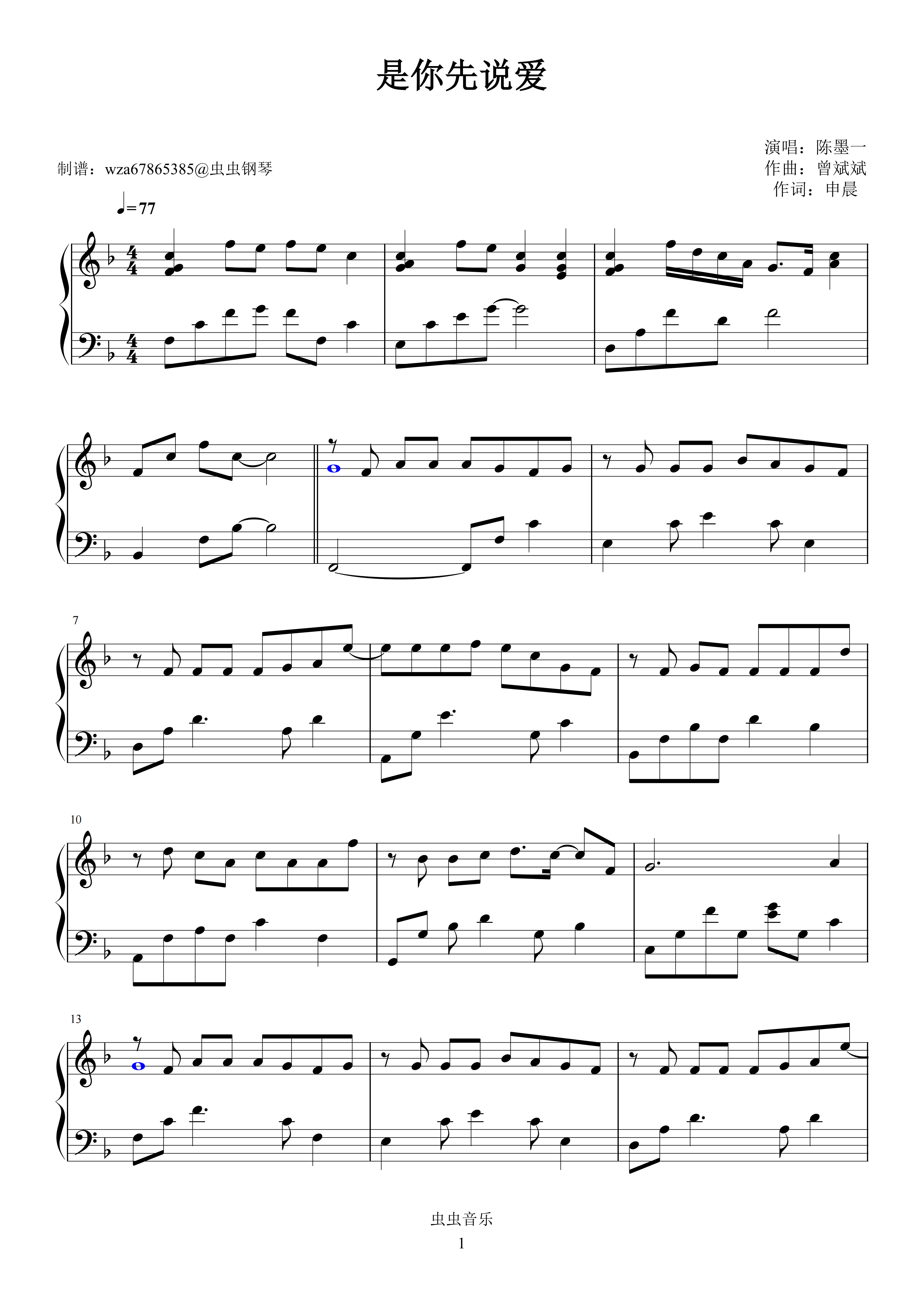 • 我爱你,中国钢琴简谱 F调 数字双手 瞿琮