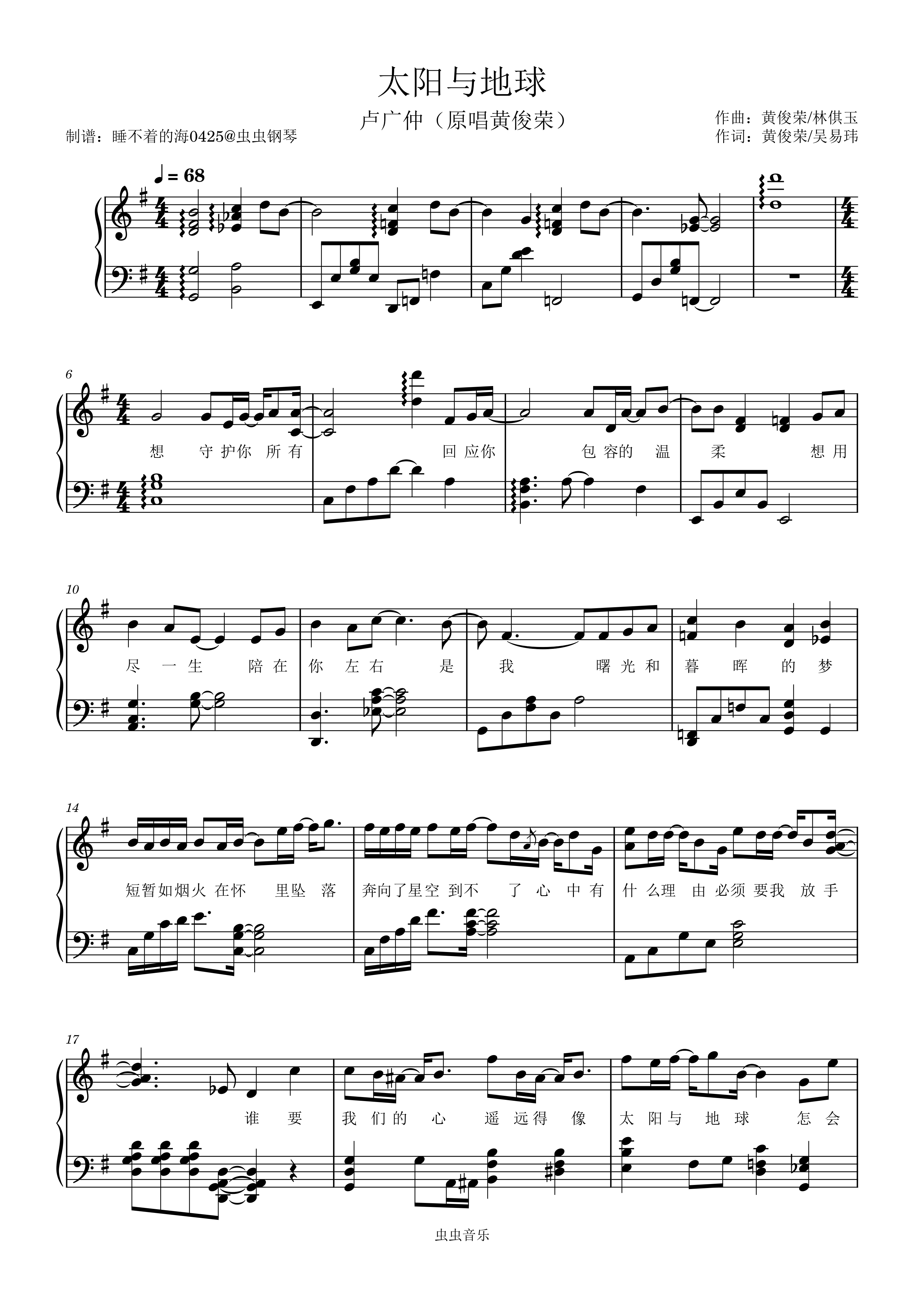 太阳与地球钢琴简谱 数字双手 黄俊荣/吴易玮