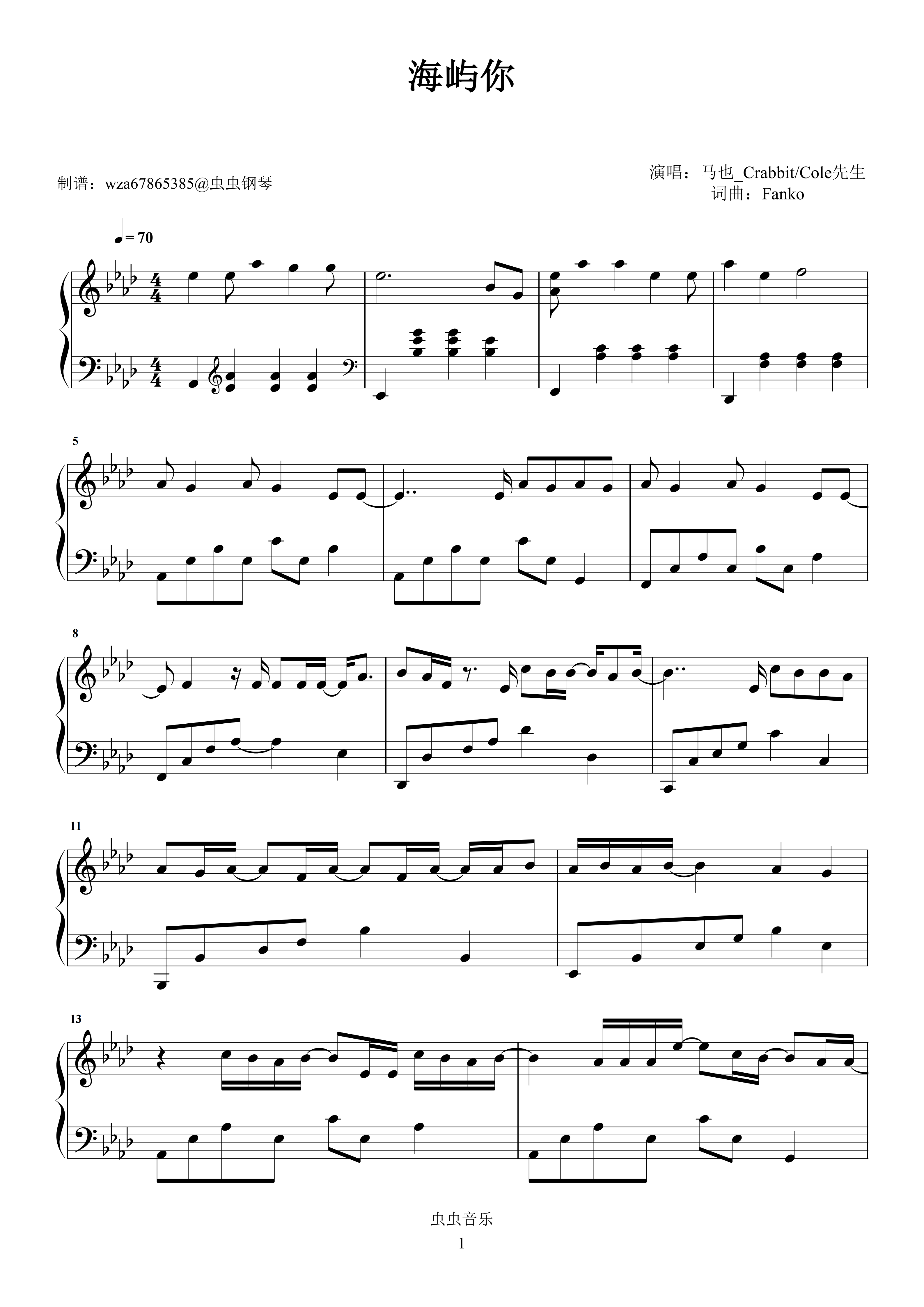 • 心引力钢琴简谱 C调 数字双手 钟婉芸