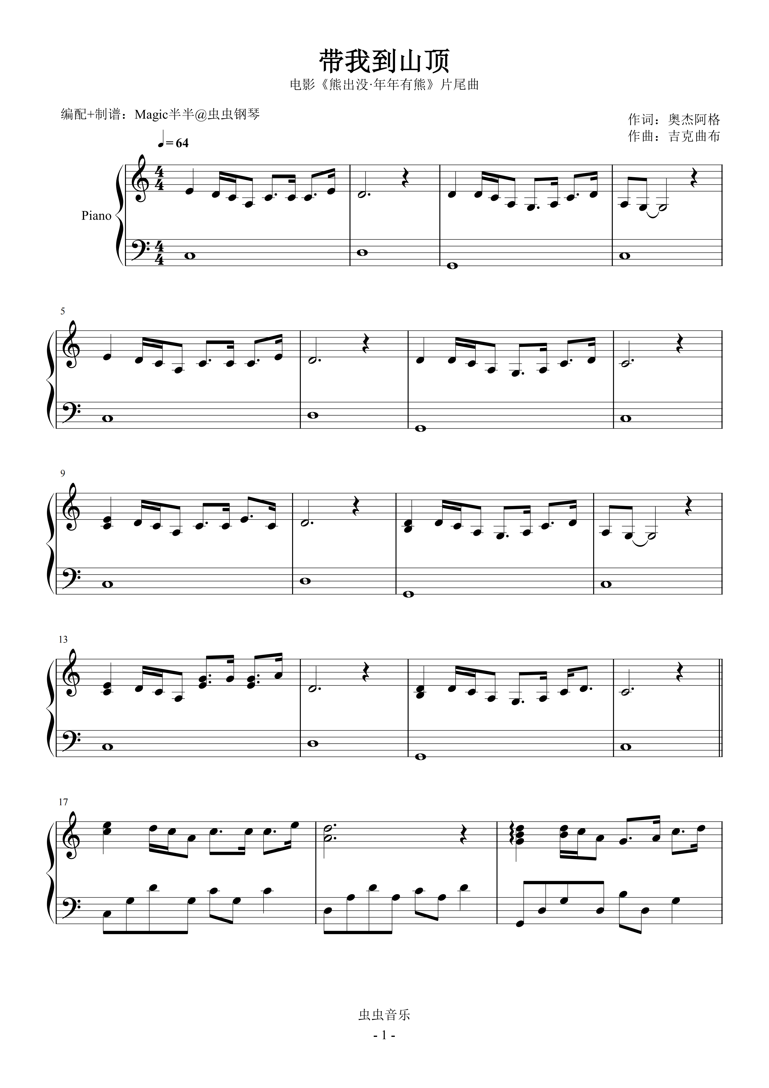 钢琴谱:带我到山顶(实用治愈/独奏版/C调) <熊出没·年年有熊>电影片尾曲