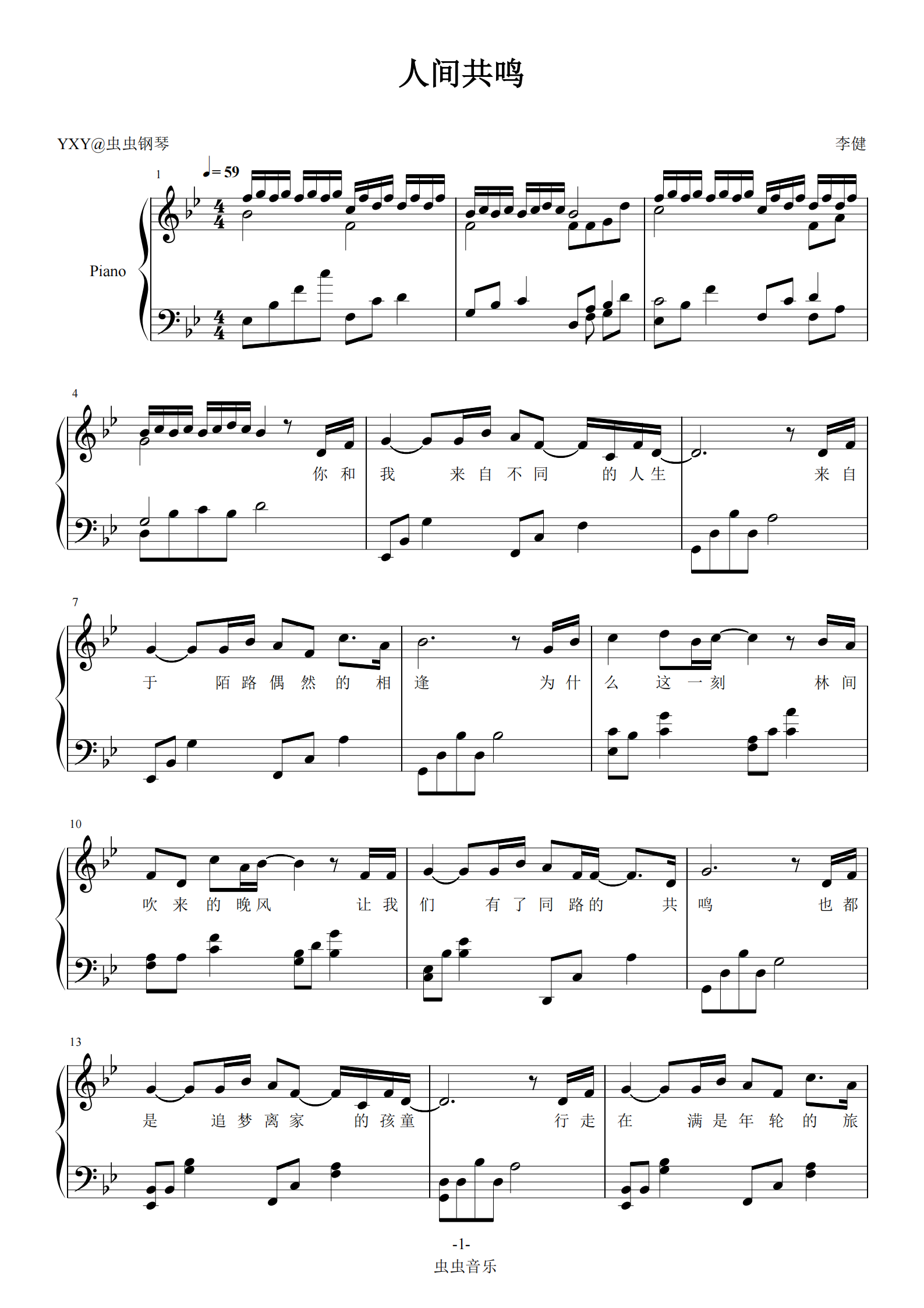 钢琴谱:人间共鸣-钢琴精编版(原调,附歌词)