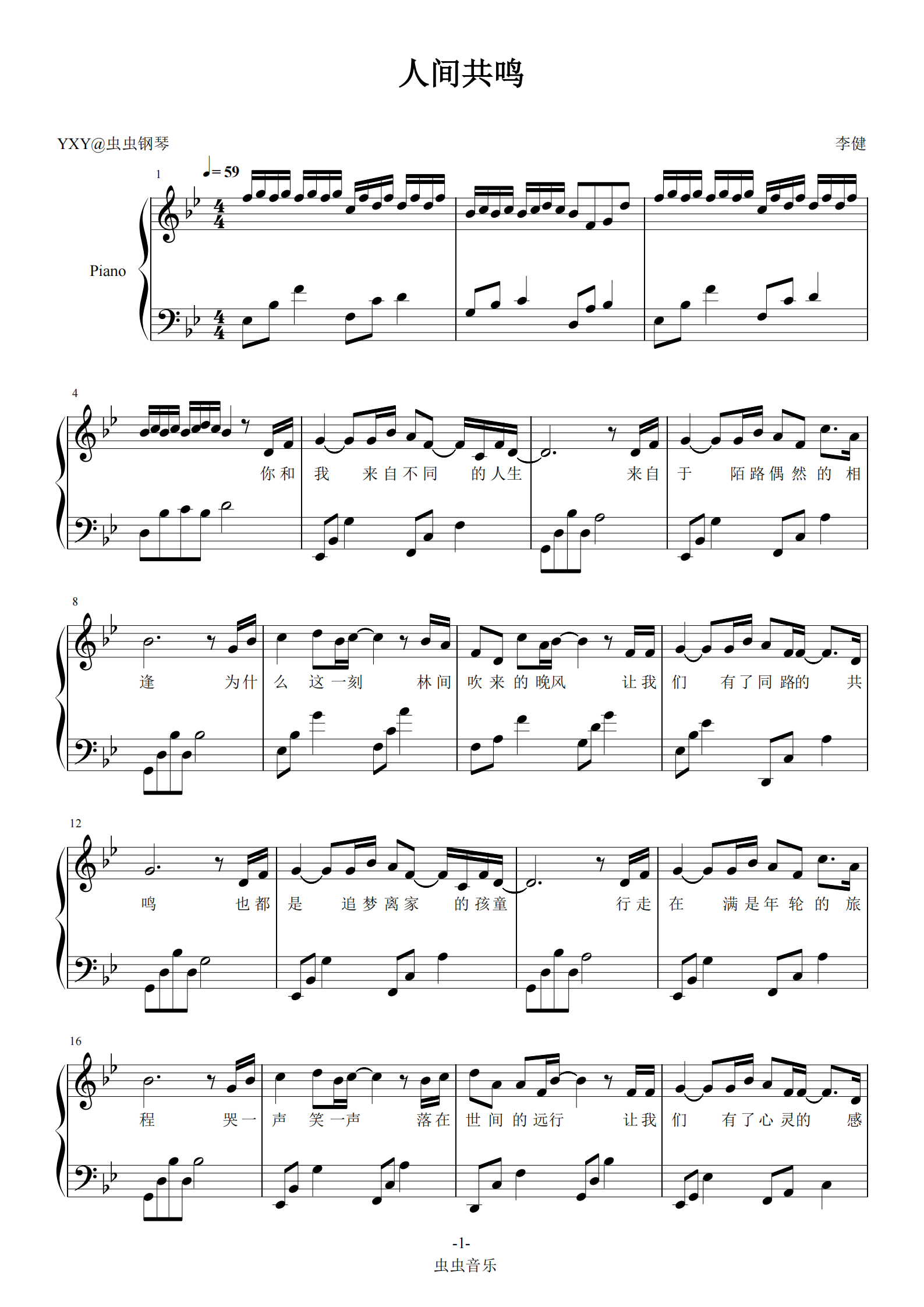 钢琴谱:人间共鸣-钢琴简化版(原调,附歌词)