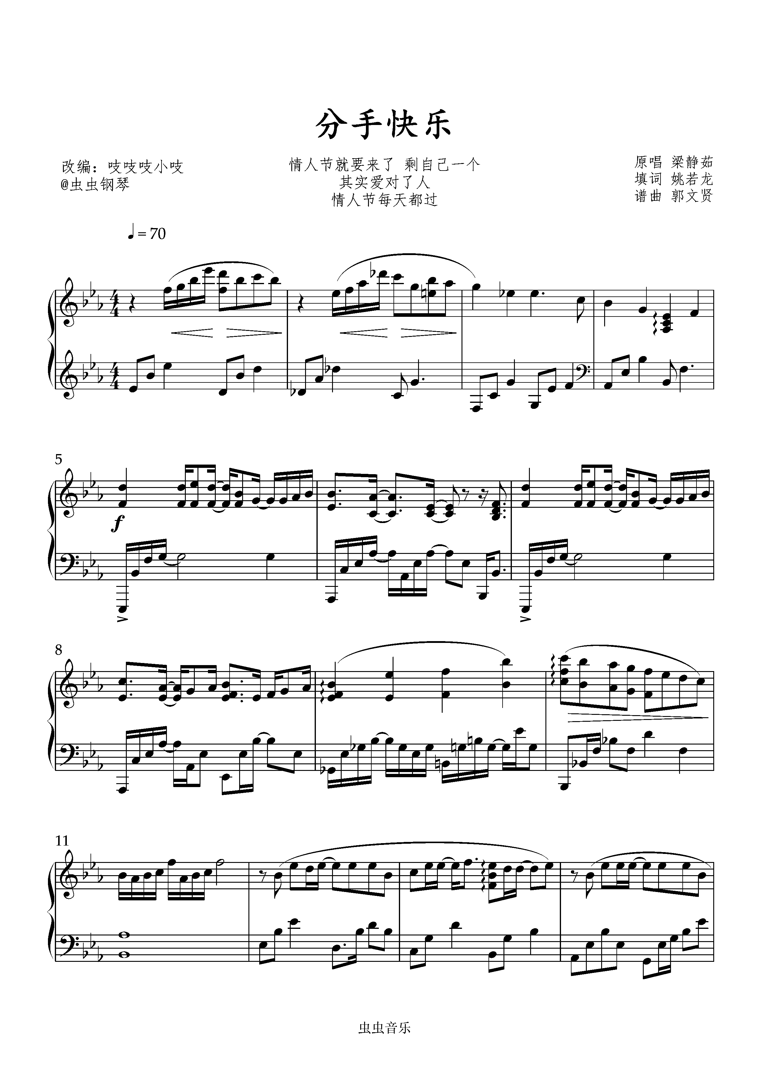 钢琴谱:分手快乐 「华语经典」梁静茹 原调精简演奏 吱吱改编