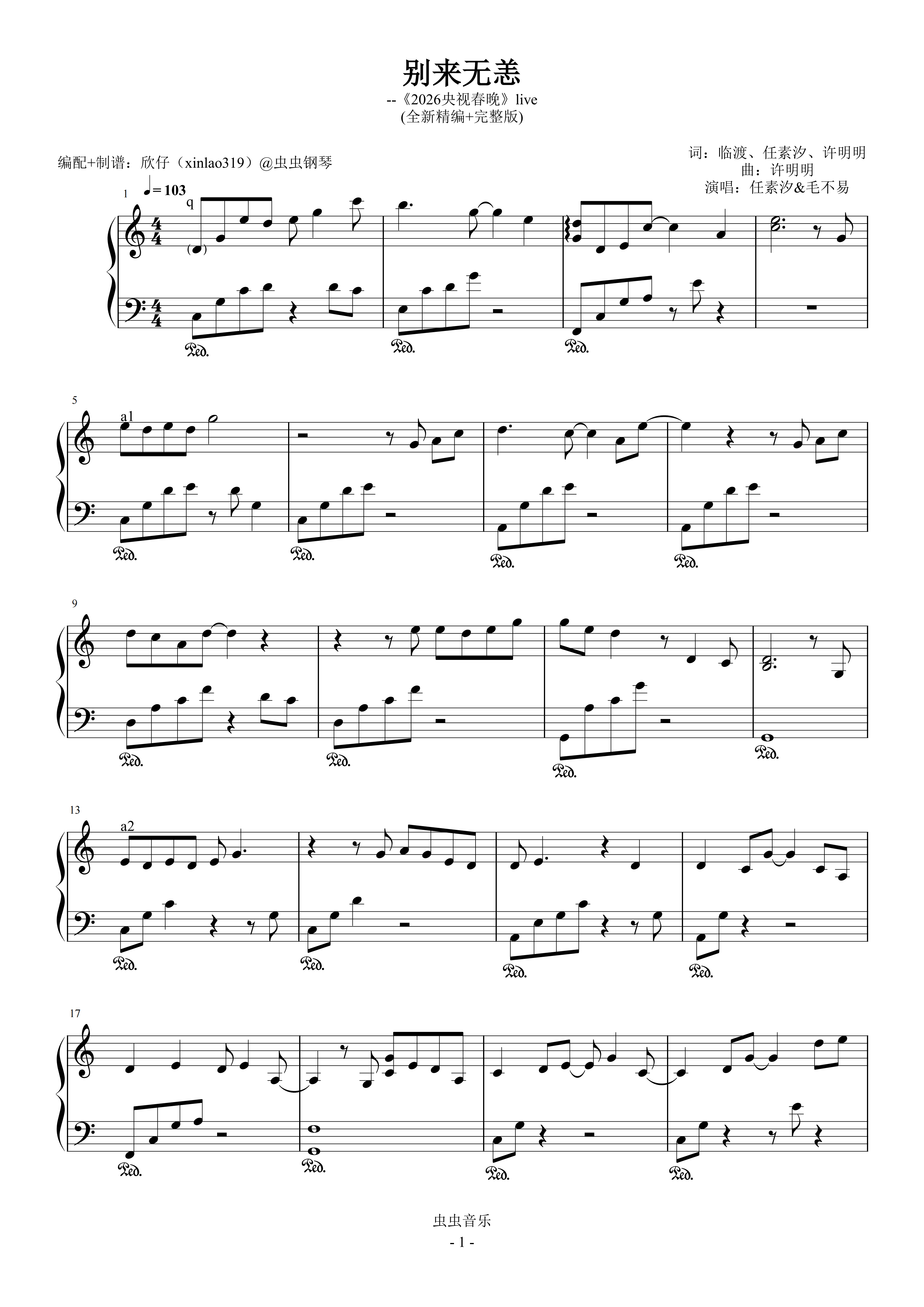 钢琴谱:别来无恙(C、任素汐&毛不易《2026央视春晚》live、完整版)