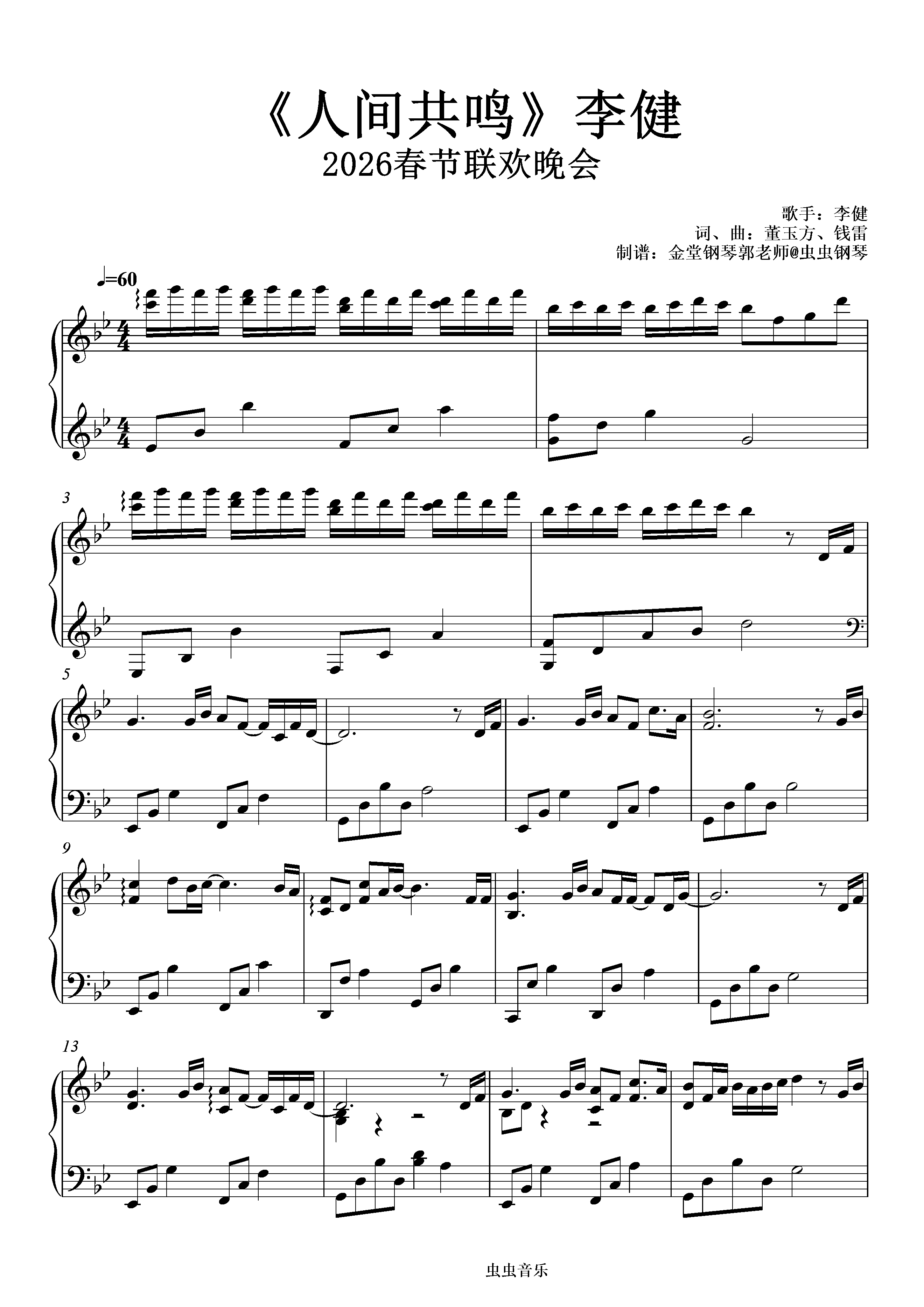 钢琴谱:《人间共鸣》李健-2026春晚歌曲
