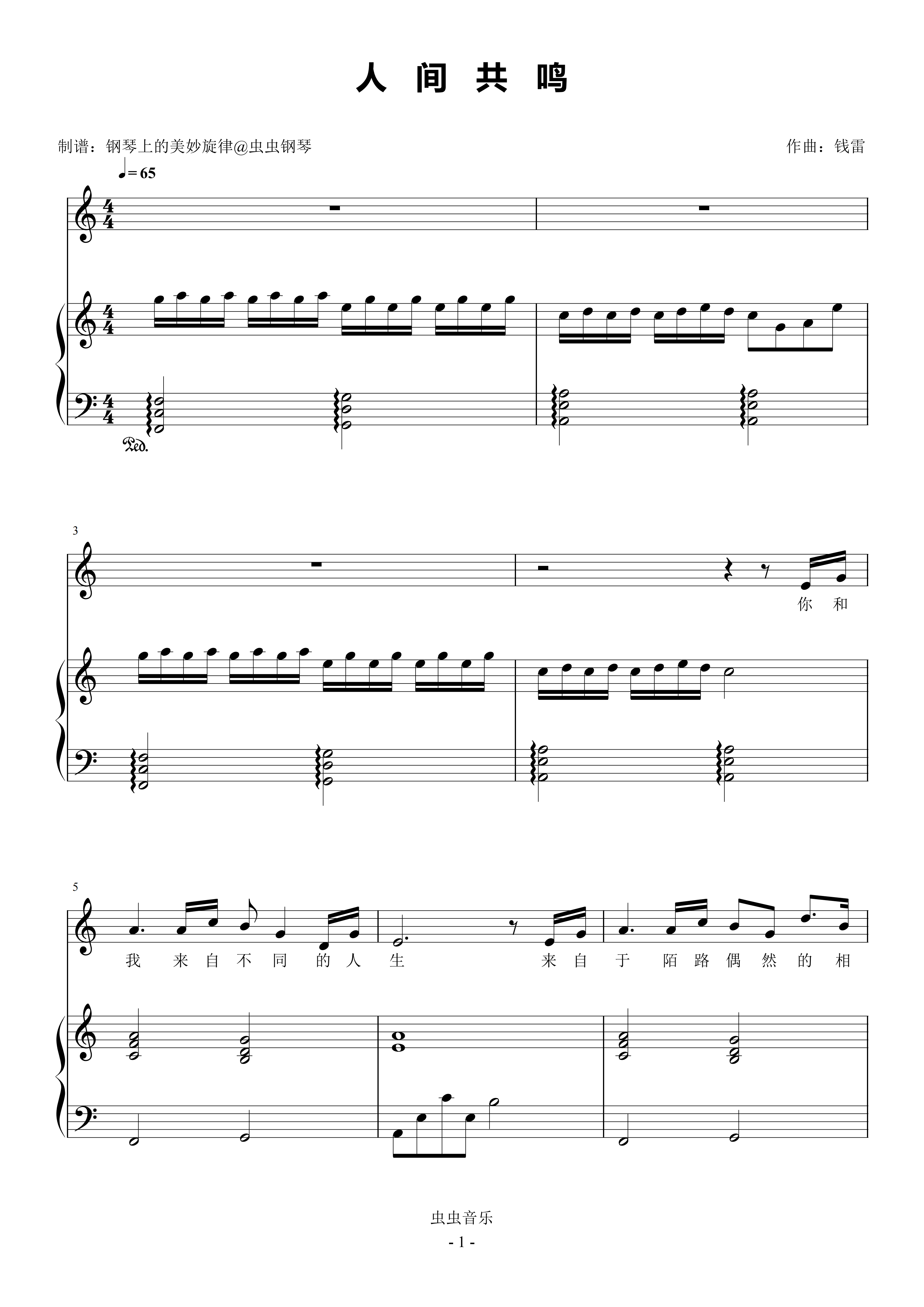 钢琴谱:人间共鸣 C调简易钢琴弹唱伴奏 带歌词 李健 2026年春晚歌曲