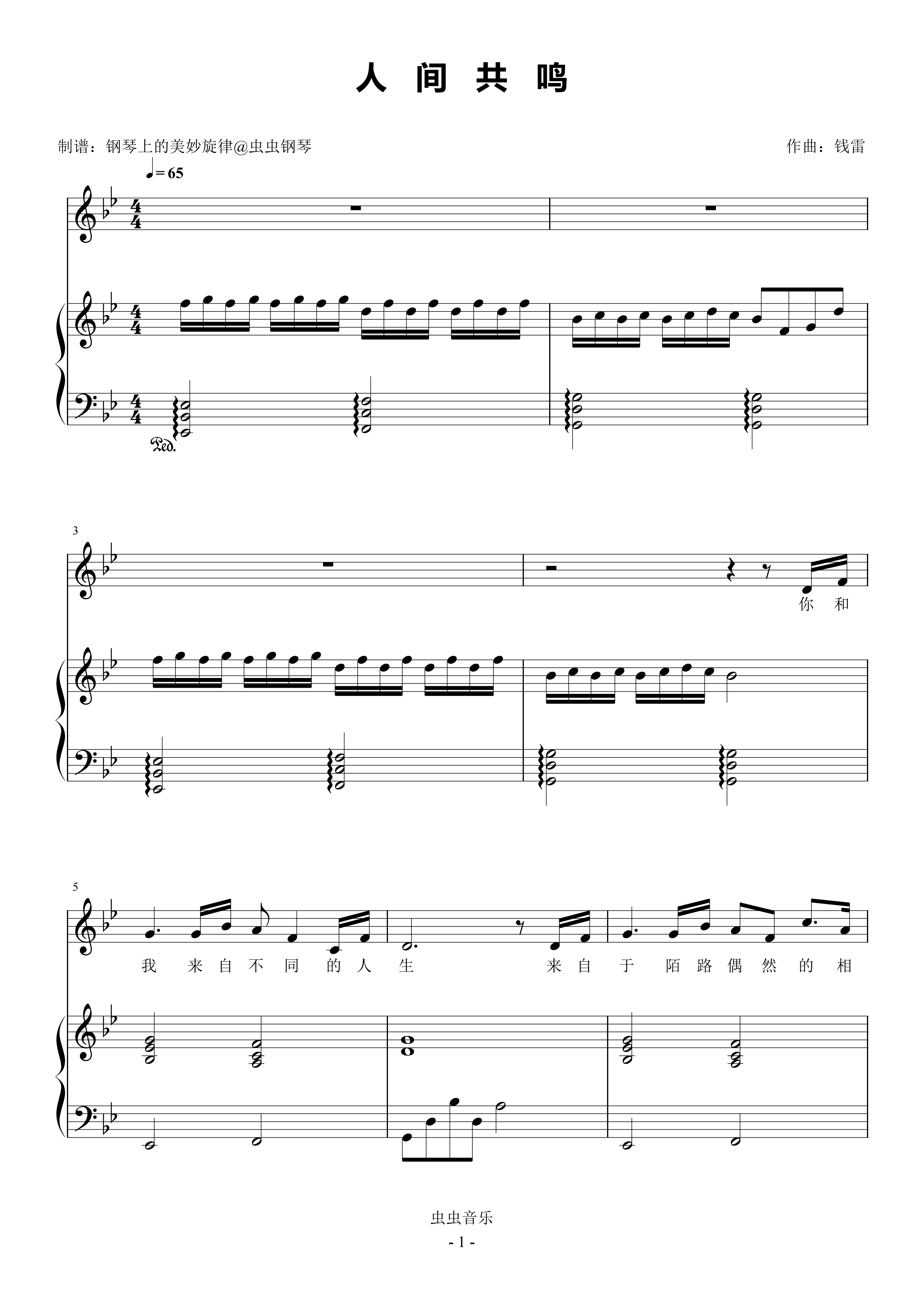 钢琴谱:人间共鸣 原调简易钢琴弹唱伴奏 带歌词 李健 2026年春晚歌曲