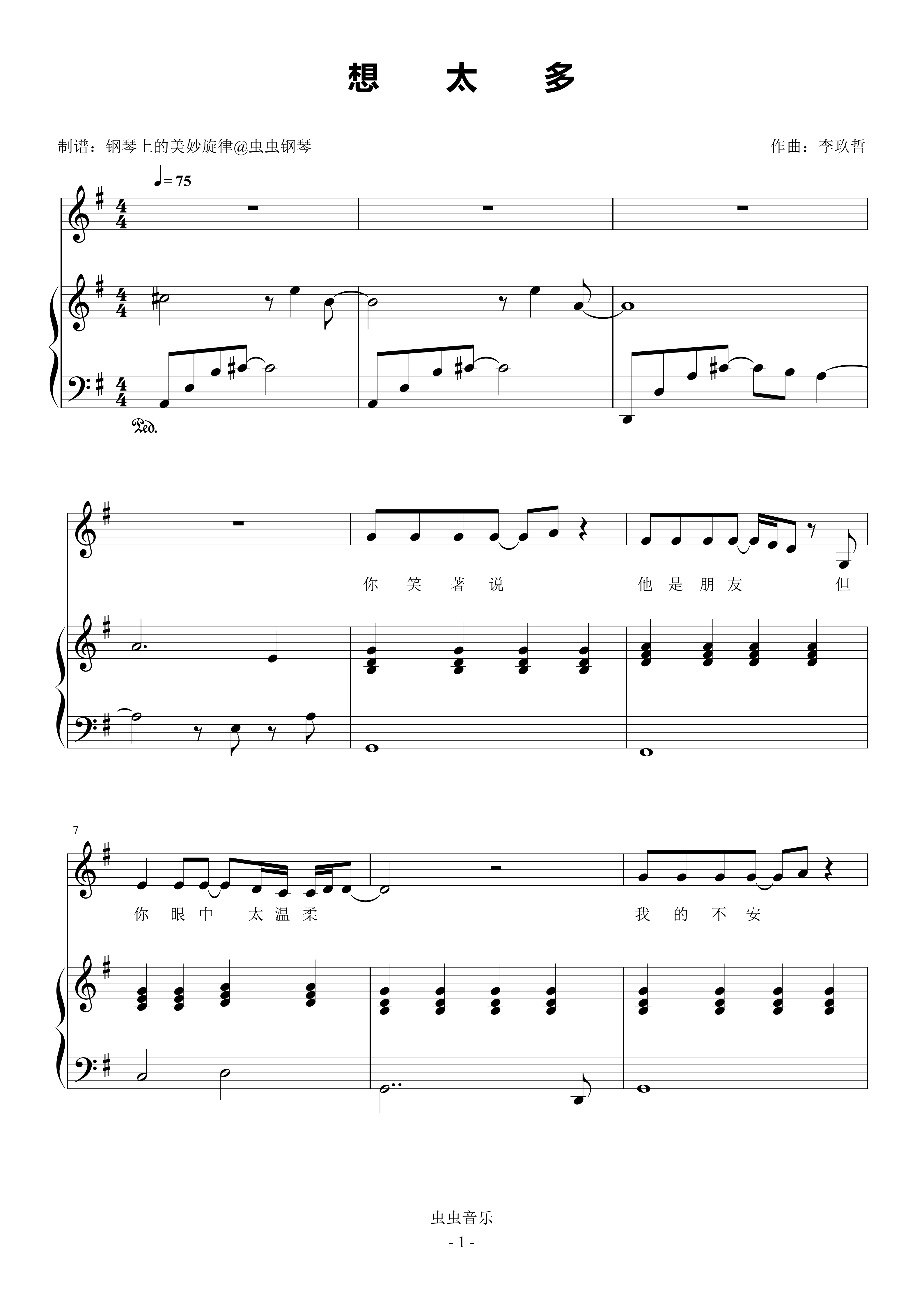 钢琴谱:想太多 简易钢琴弹唱伴奏 带歌词 李玖哲