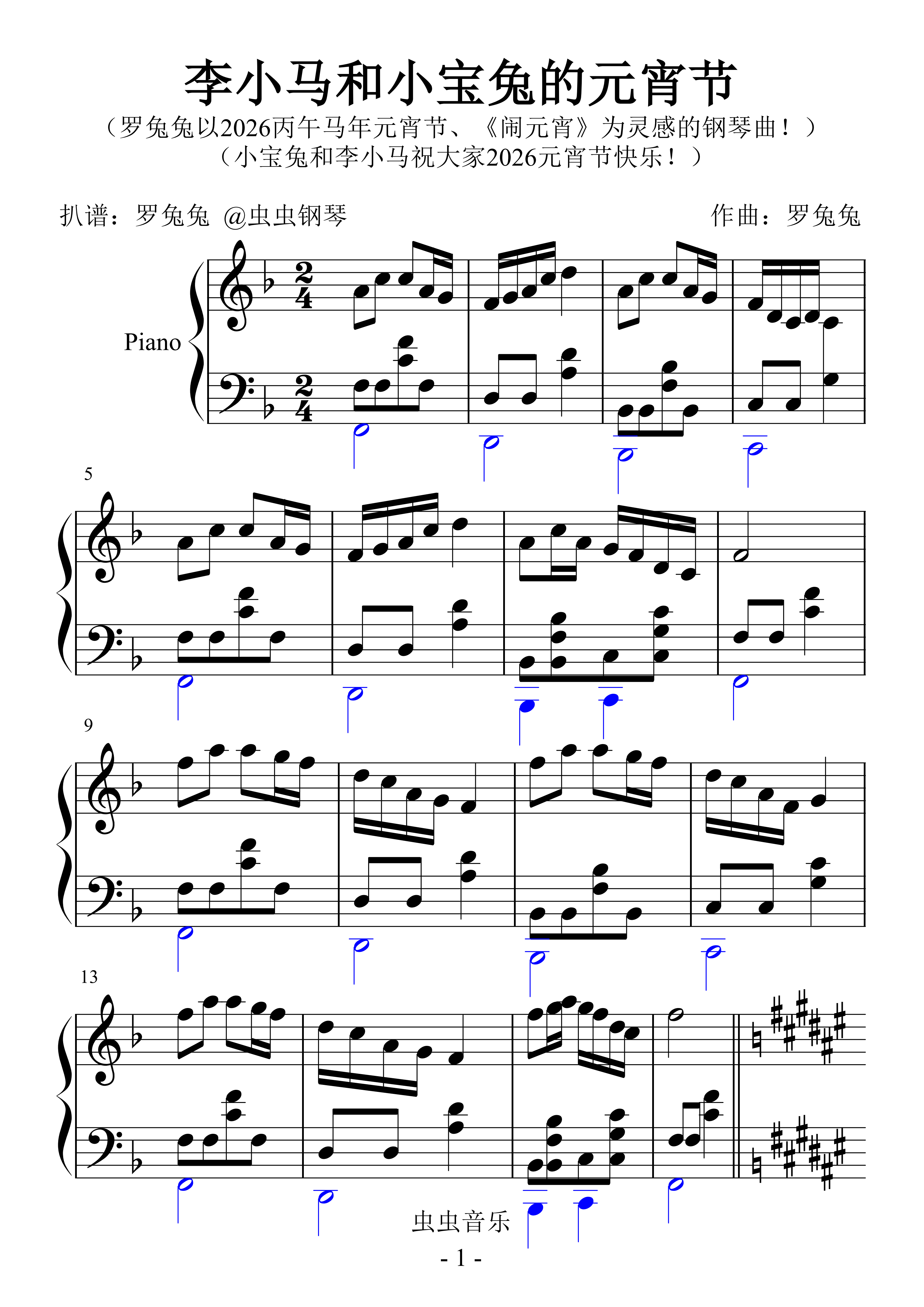 钢琴谱:李小马和小宝兔的元宵节(小宝兔和李小马祝大家2026元宵节快乐!)