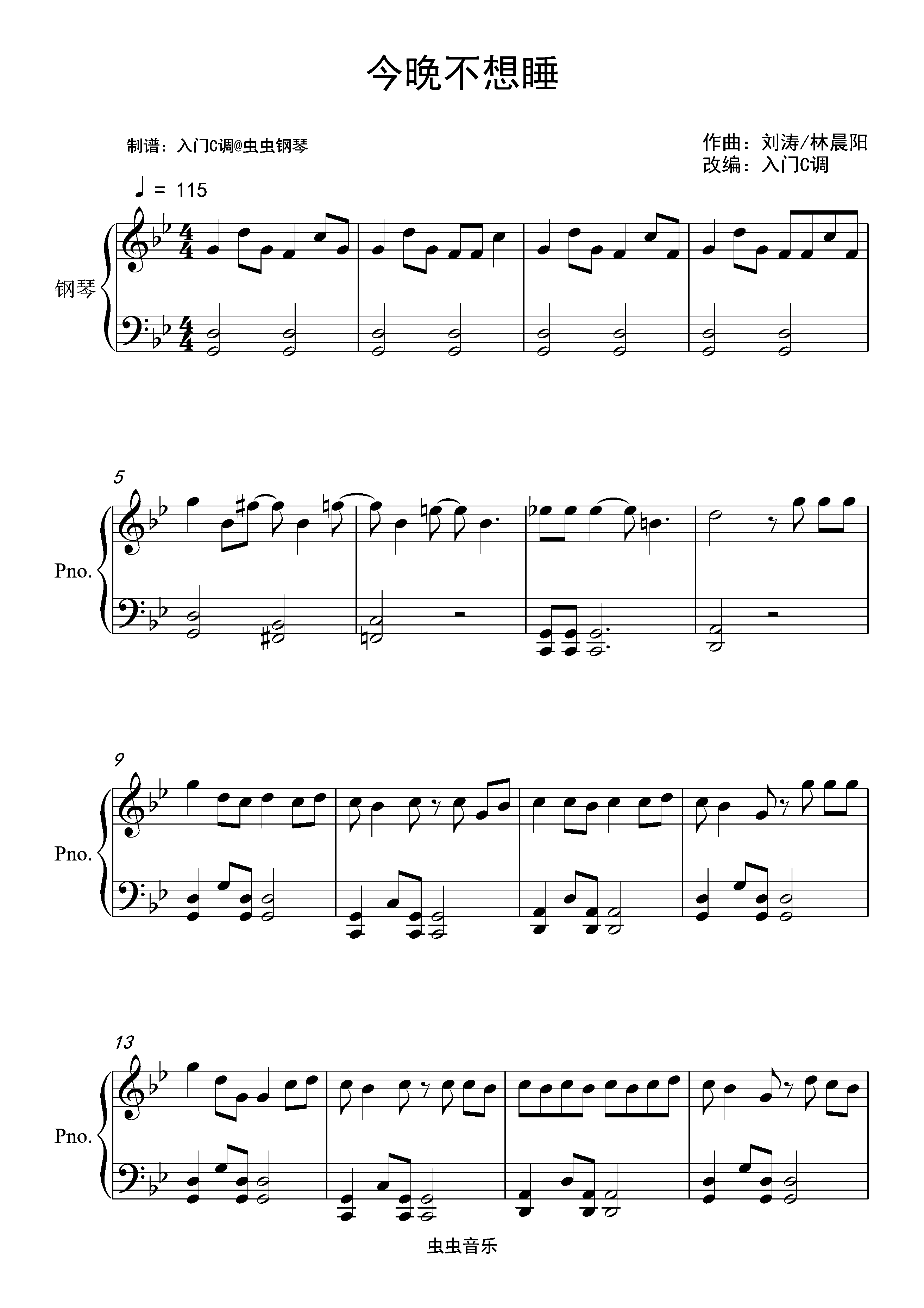 钢琴谱:今夜不想睡—王大毛【原调入门简单版】
