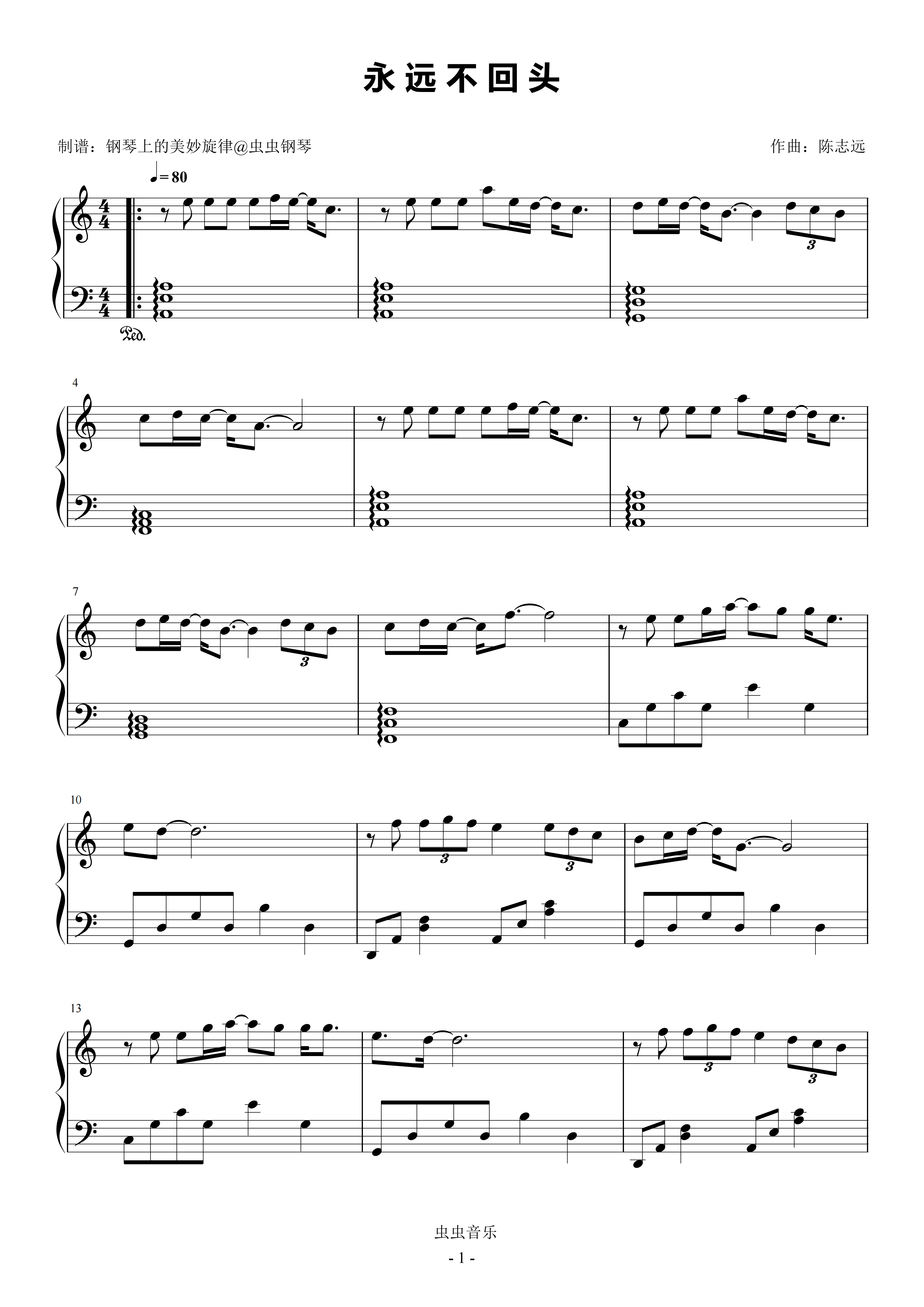 钢琴谱:永远不回头 C调简易版 沈腾/尹正/黄景瑜/张本煜/魏翔 飞驰人生3