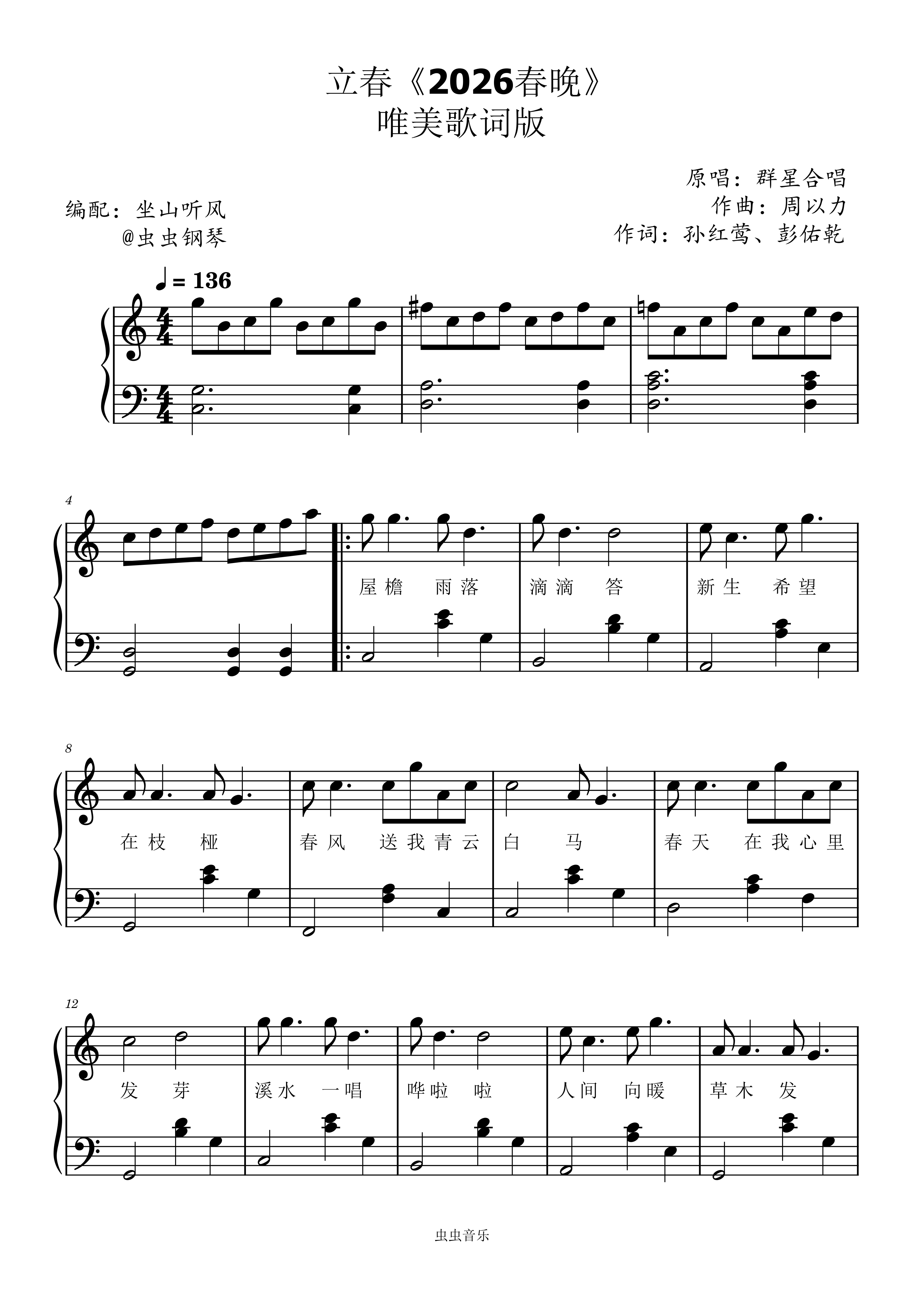 立春钢琴简谱 数字双手 孙红莺、彭佑乾