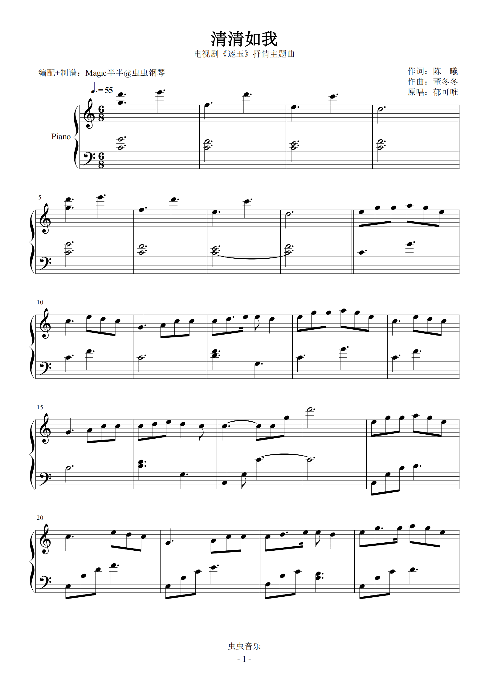 钢琴谱:清清如我(实用完整版/C调) <逐玉>抒情主题曲