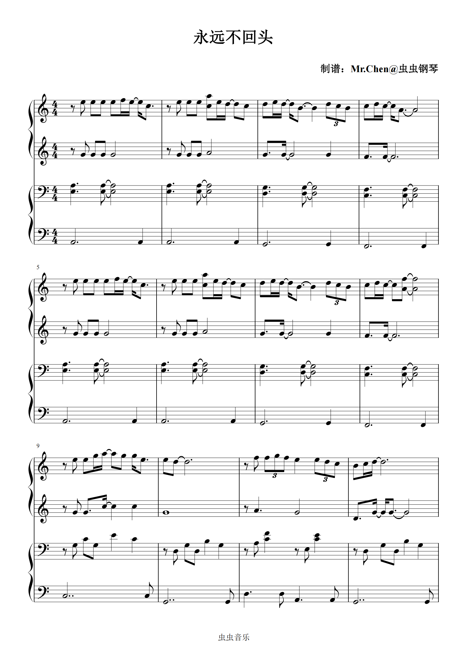 钢琴谱:永远不回头 (四手联弹)C调 - 电影《飞驰人生3》插曲
