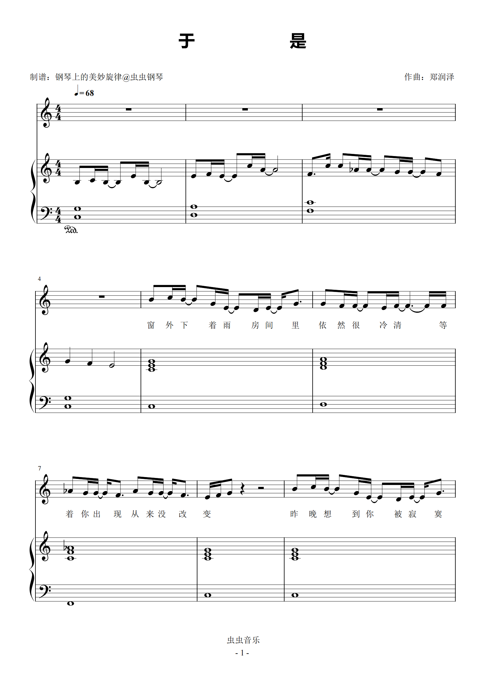 钢琴谱:于是 C调简易钢琴弹唱伴奏 带歌词 郑润泽