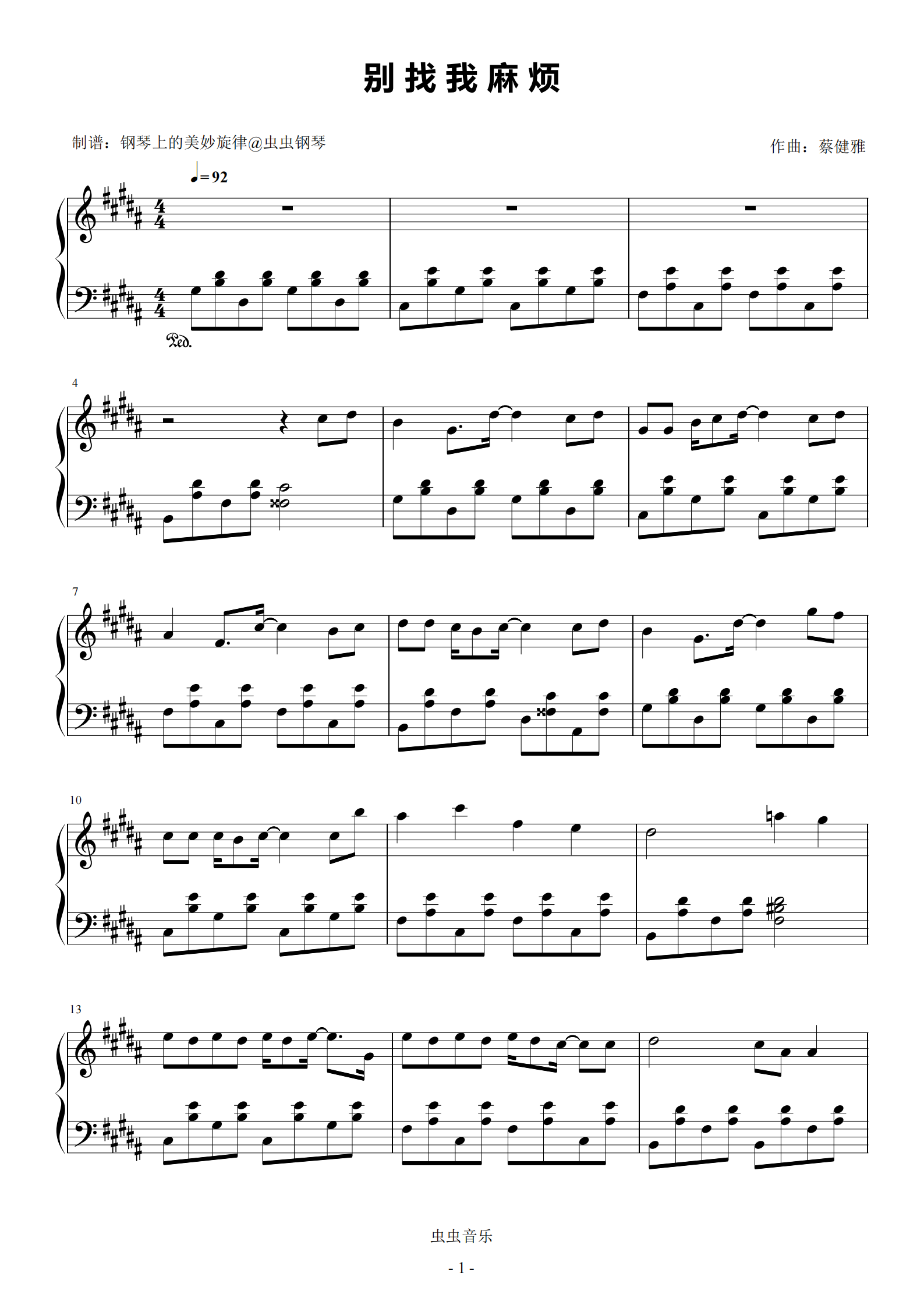 • 别找我麻烦钢琴简谱 a调 数字双手 蔡健雅