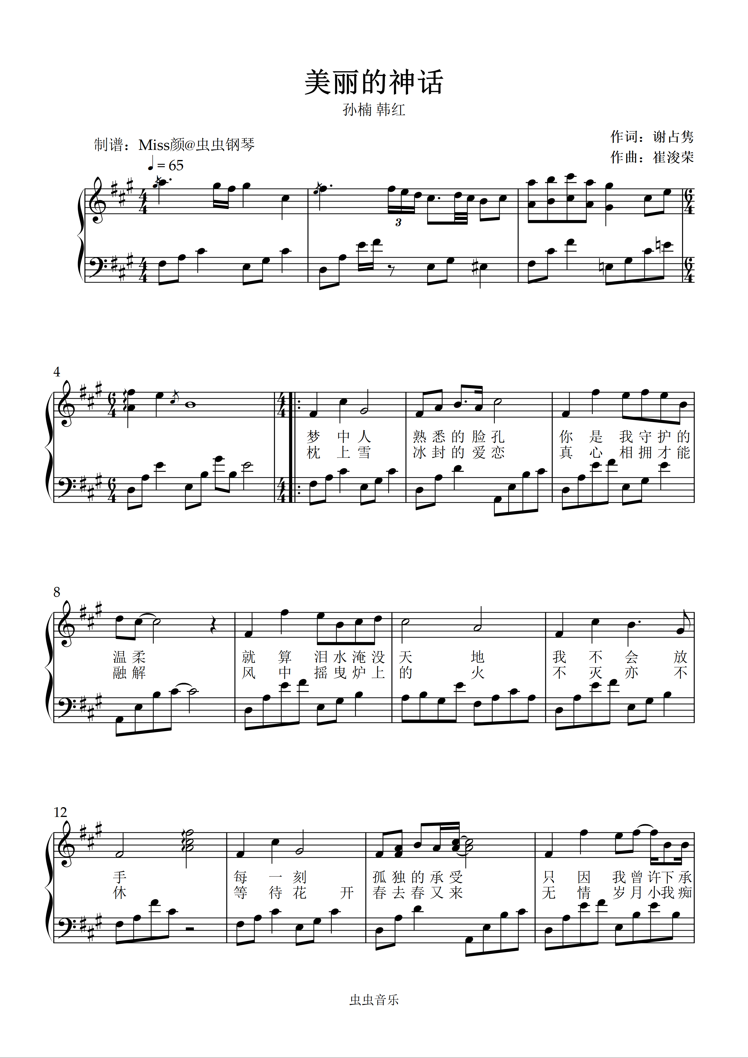 钢琴谱:美丽的神话 孙楠 韩红 A调