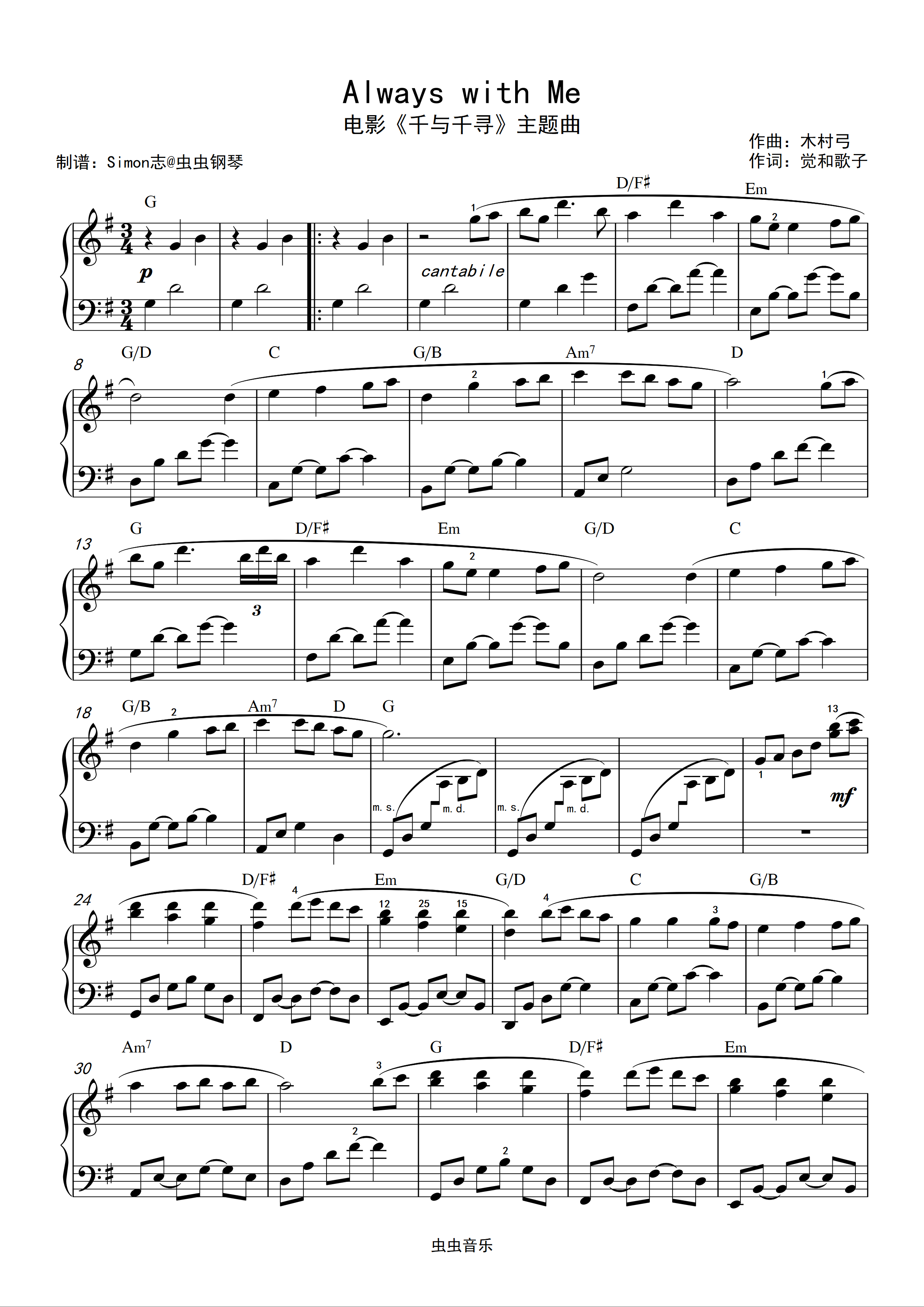 钢琴谱:千与千寻主题曲《Always with Me》永远同在-G调原版