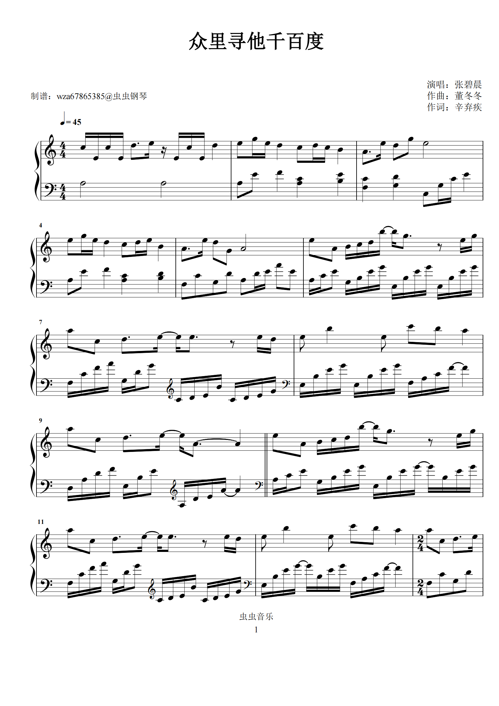 钢琴谱:众里寻他千百度