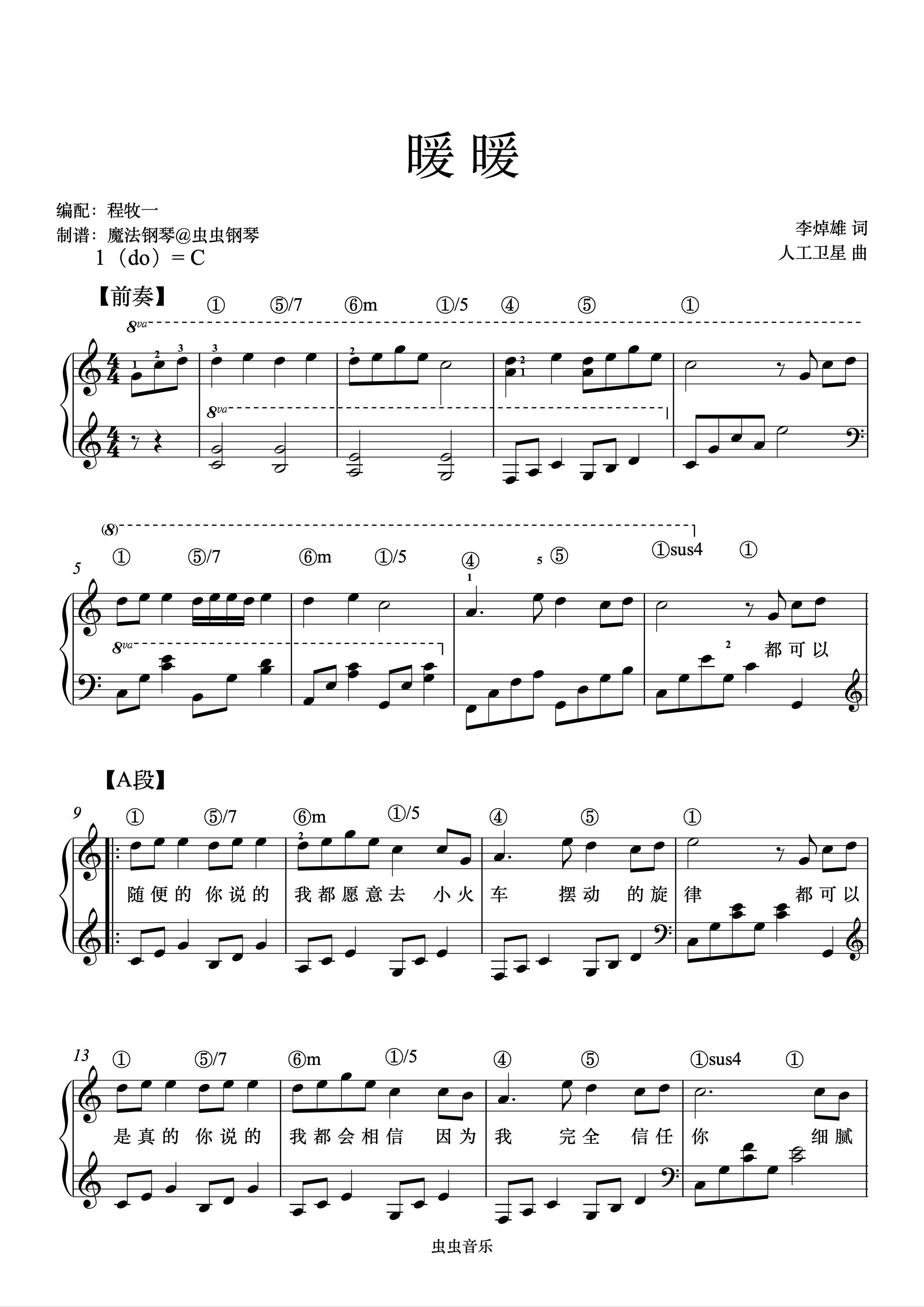 • 暖暖钢琴简谱 C调 数字双手 李焯雄