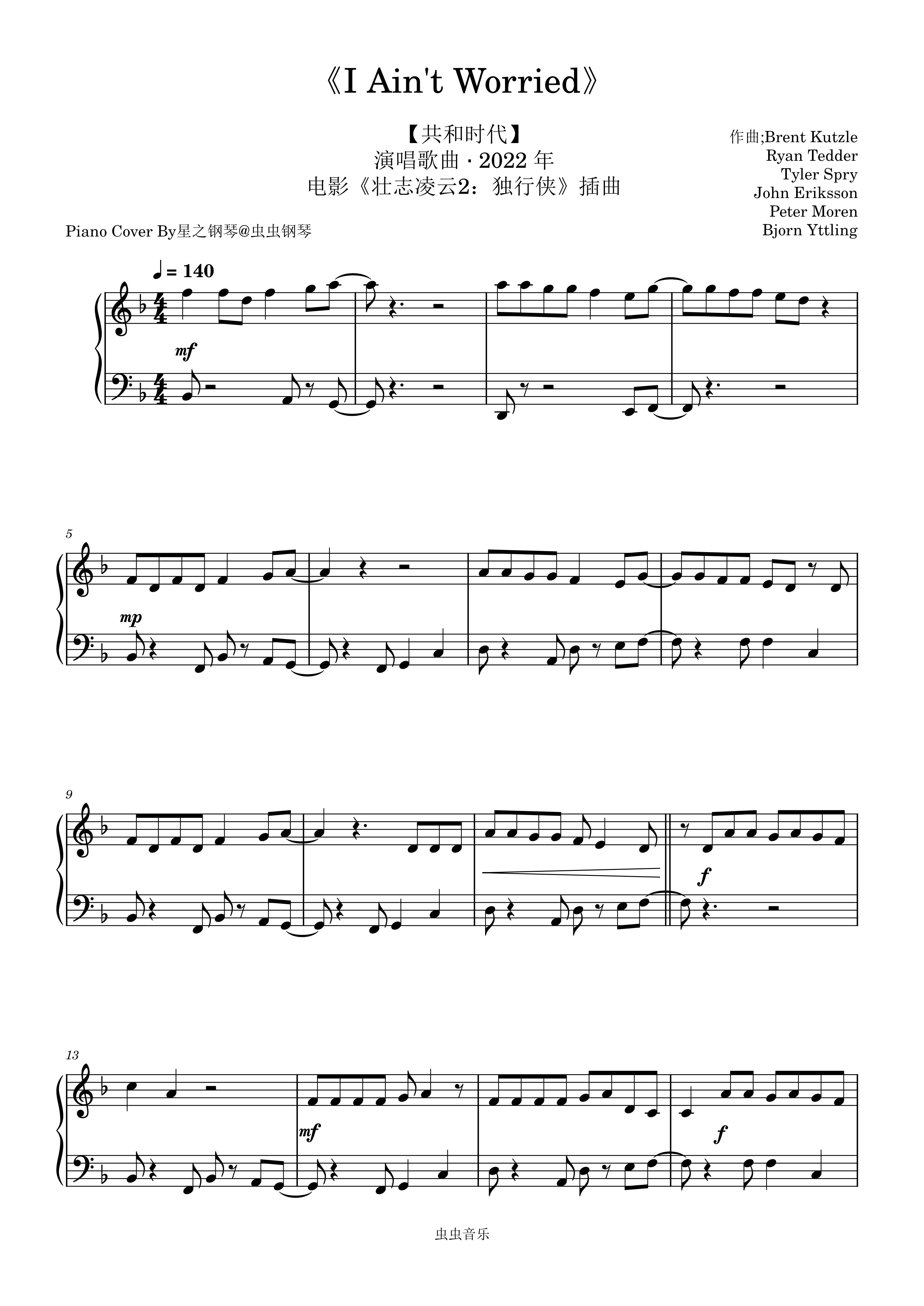 I Ain’t Worried钢琴简谱 数字双手 Brent Kutzle、Ryan Tedder、Tyler Spry、John Eriksson、Peter Moren、Bjorn Yttling
