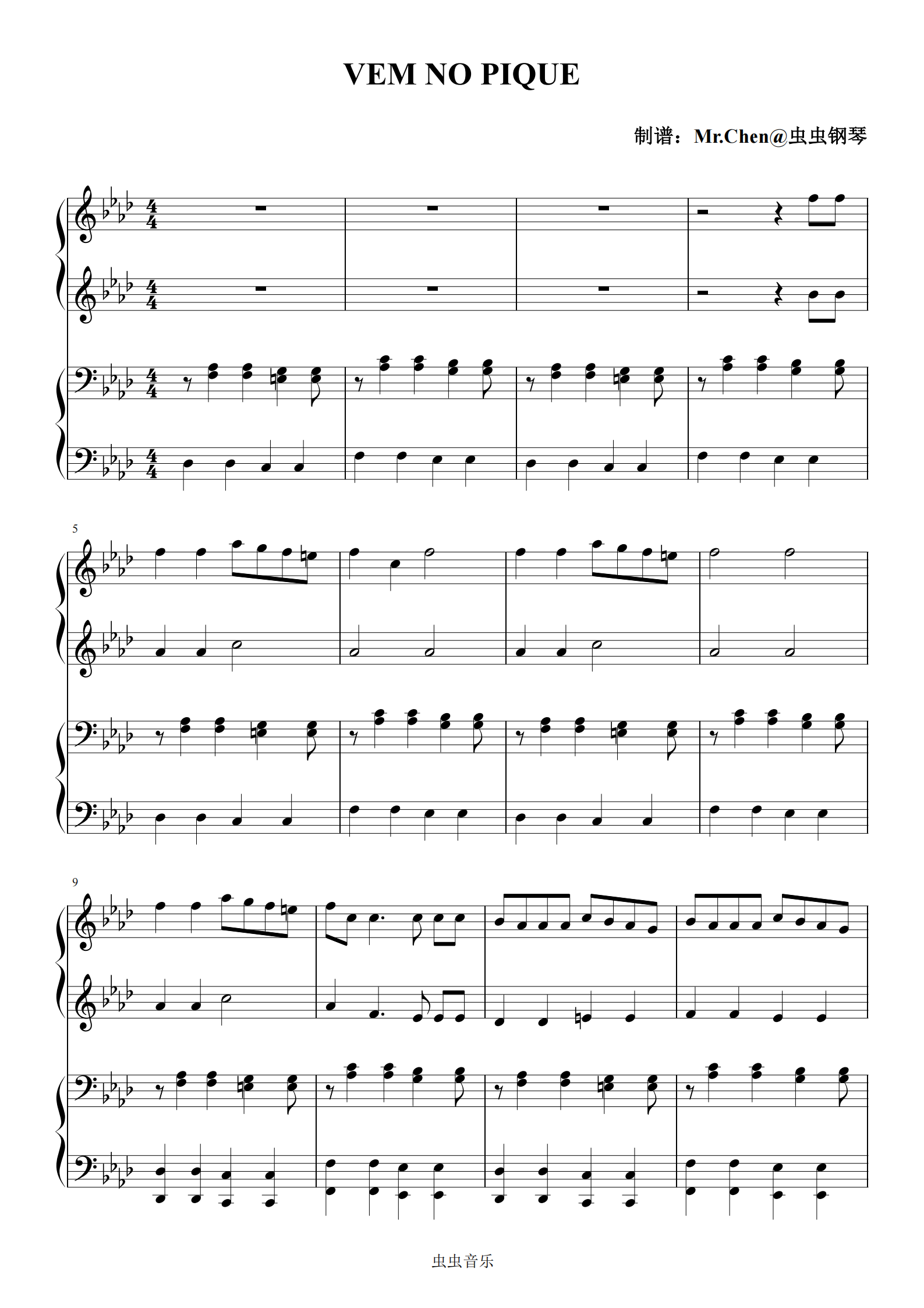 钢琴谱:VEM NO PIQUE (四手联弹)- 巴西Funk